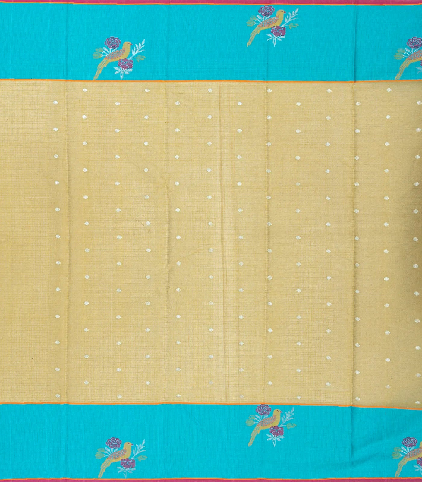 This handwoven kota silk saree is filled with floral zari buttas in dark beige body along with meena bird motifs in border and pallu