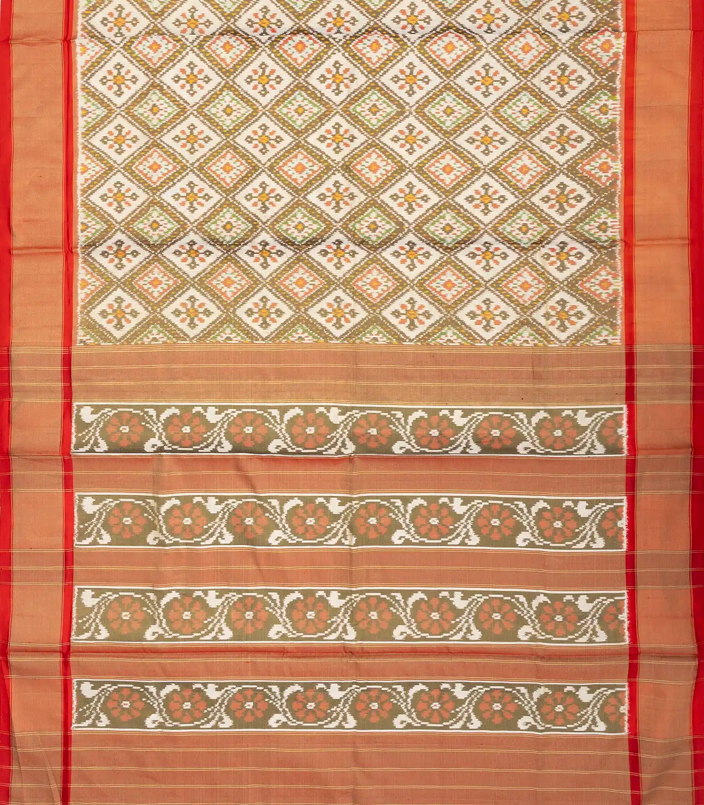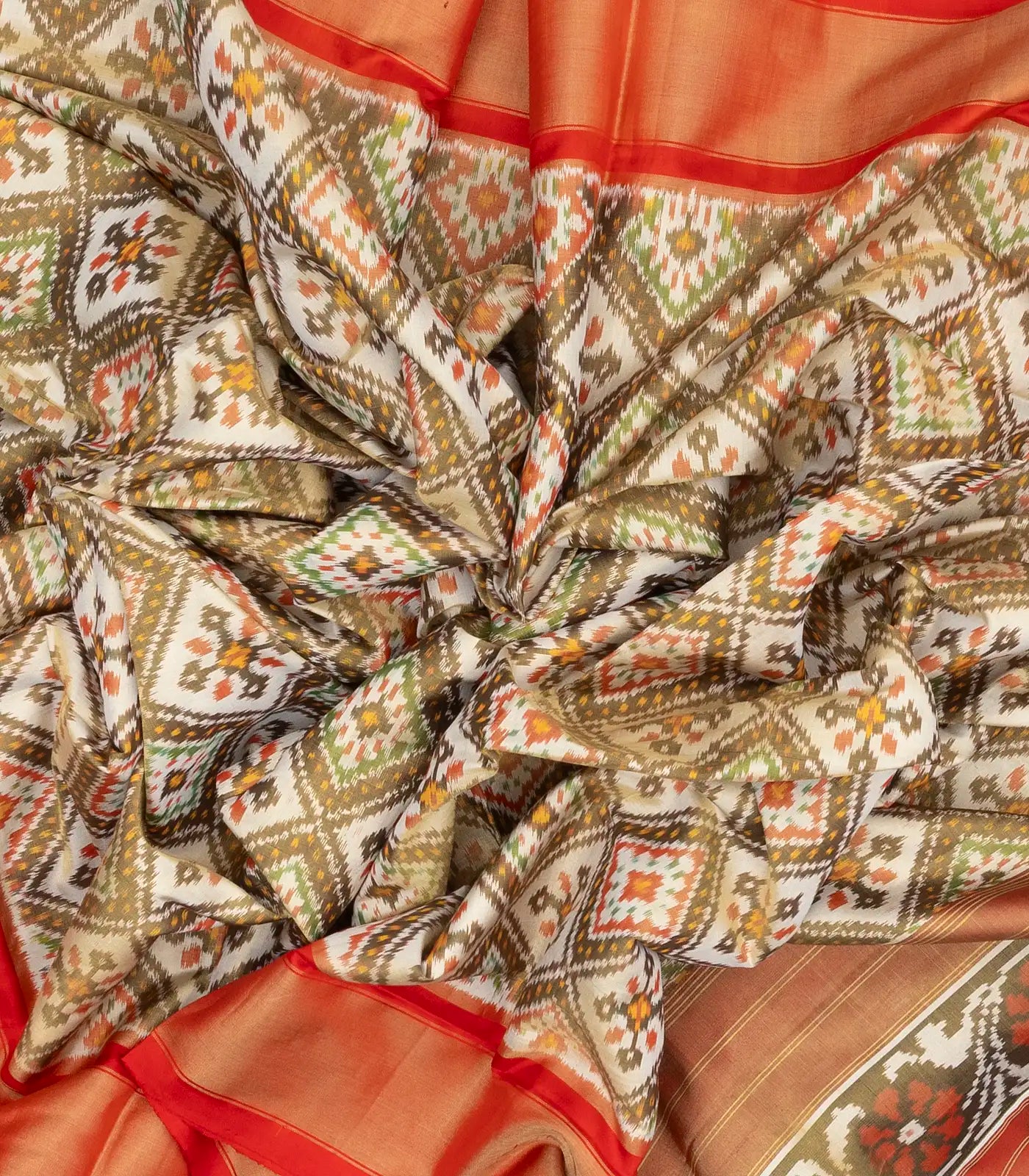 This handwoven pochampally ikat silk saree with tie & dye motifs in cardamom green body along with contrast border and pallu