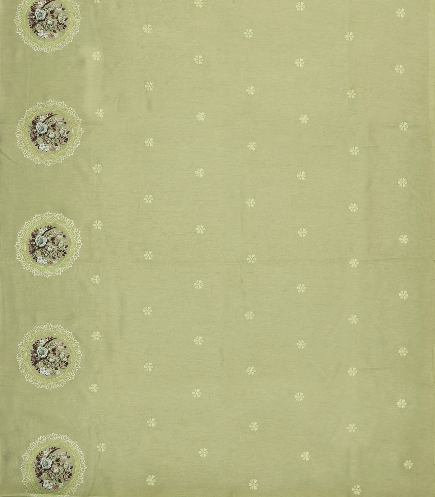 This woven art tussar saree is filled with printed & embroidered floral motifs in cardamom green body along with pallu