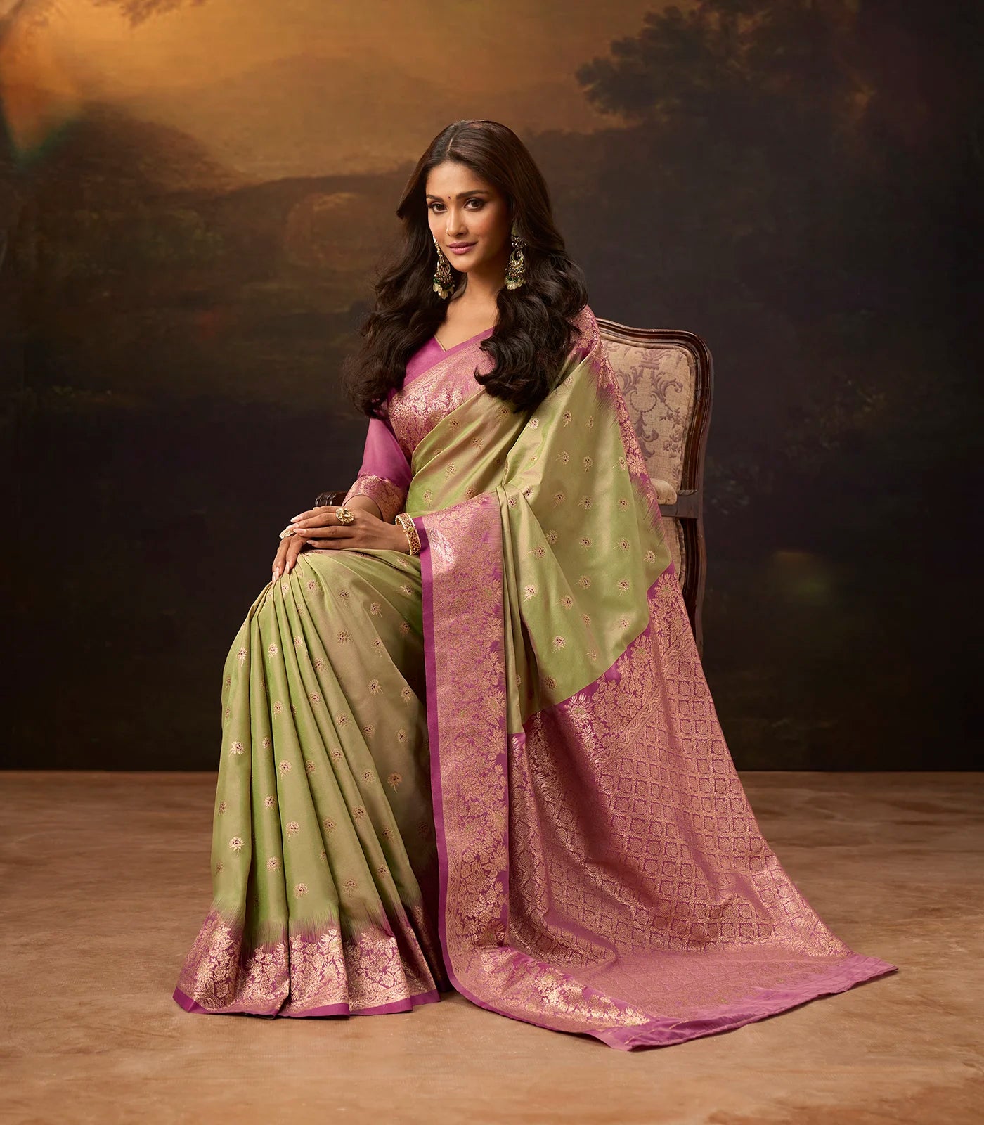 This woven bamboo soft silk saree is filled with floral motifs in cardamom green body along with heavy embroidery zircon work floral motifs in border and pallu