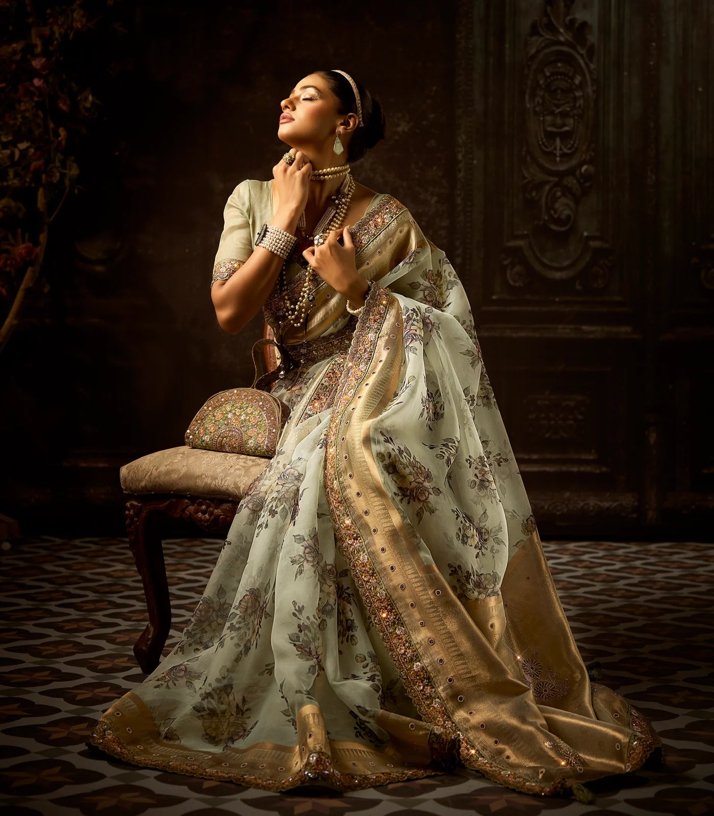 This woven organza saree is filled with printed floral motifs in cardamom green body along with Parsi Zardosi & Moti Work floral motifs in zari border and pallu