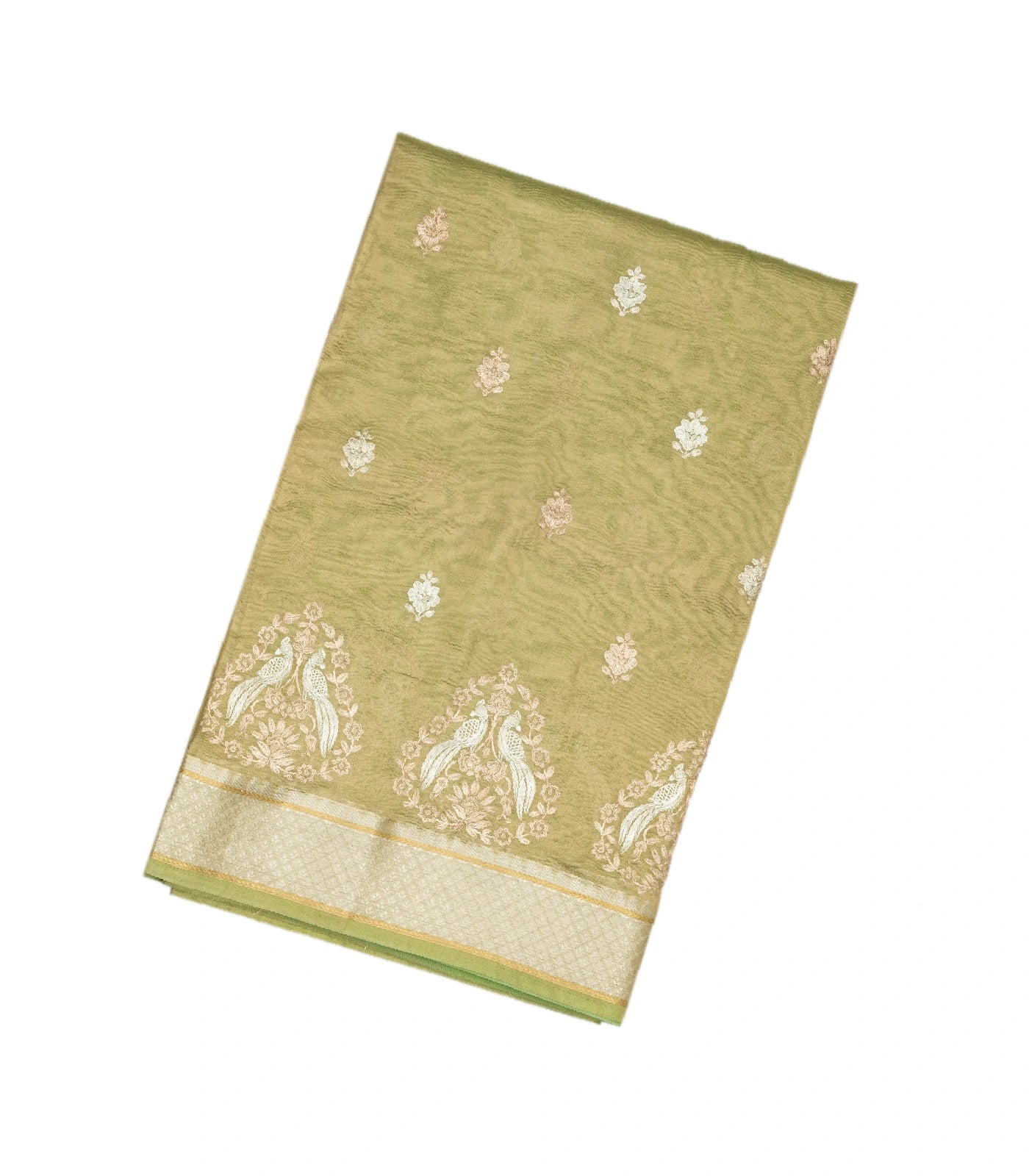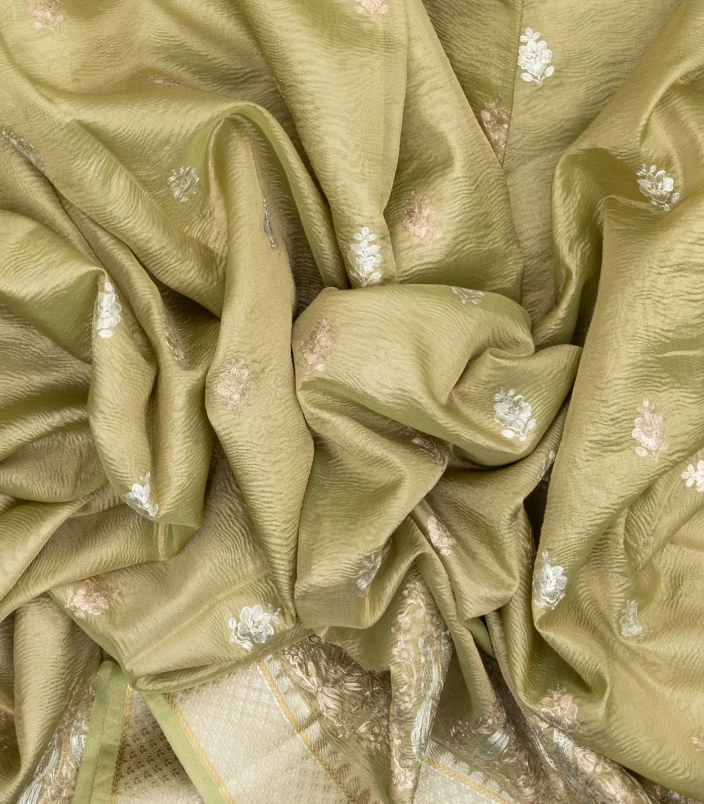 Cardamom Green Woven Crushed Tissue Saree With Embroidered Motifs