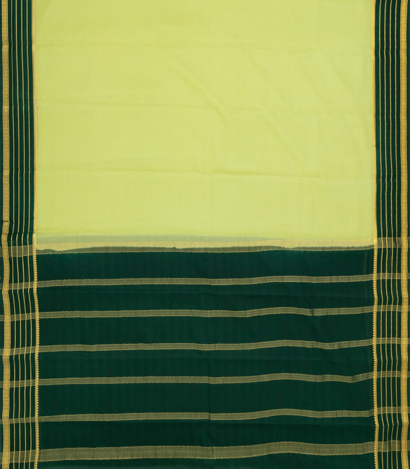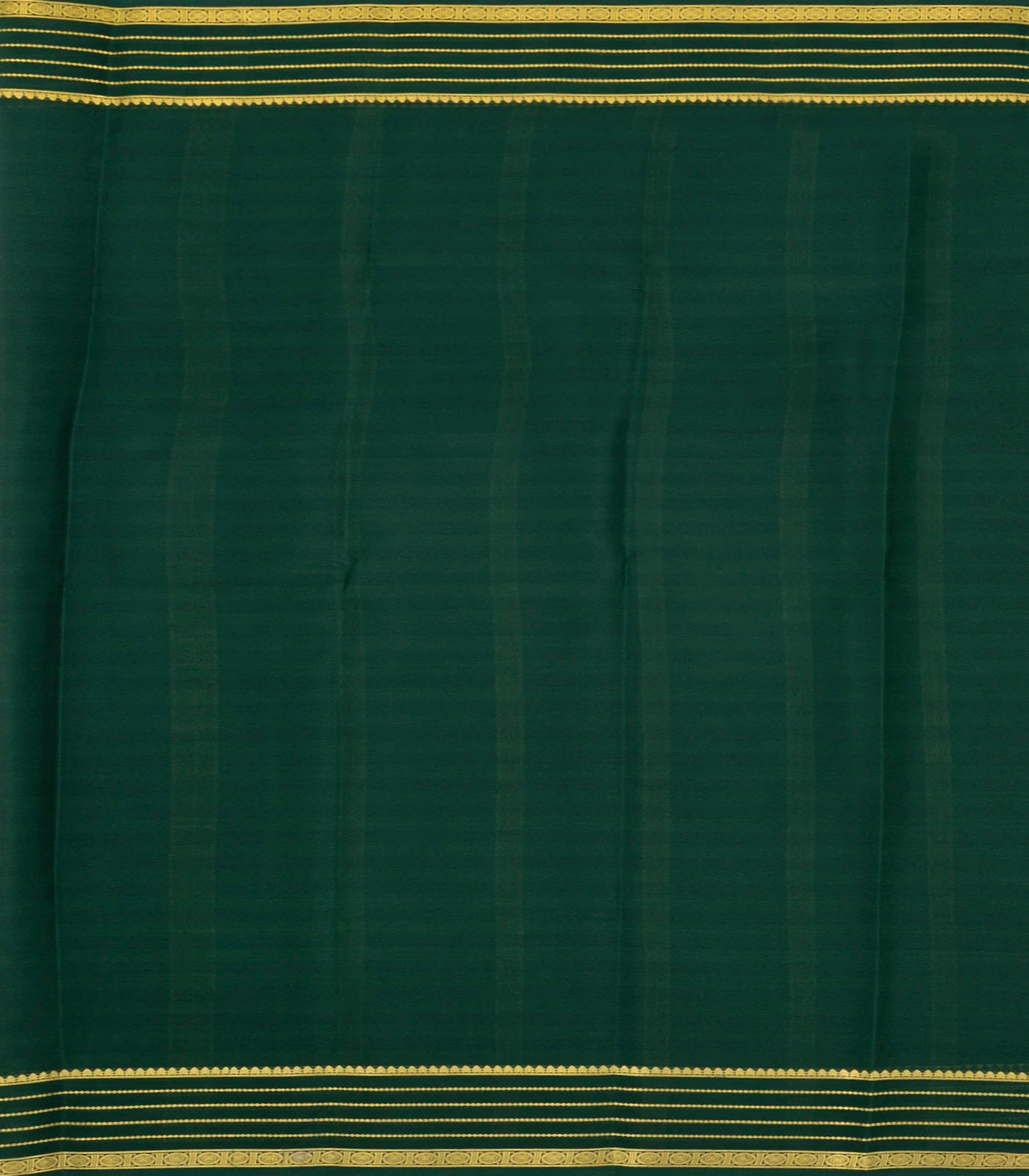This woven mysore crepe silk saree is filled with plain cardamom green body along with contrast zari border and pallu