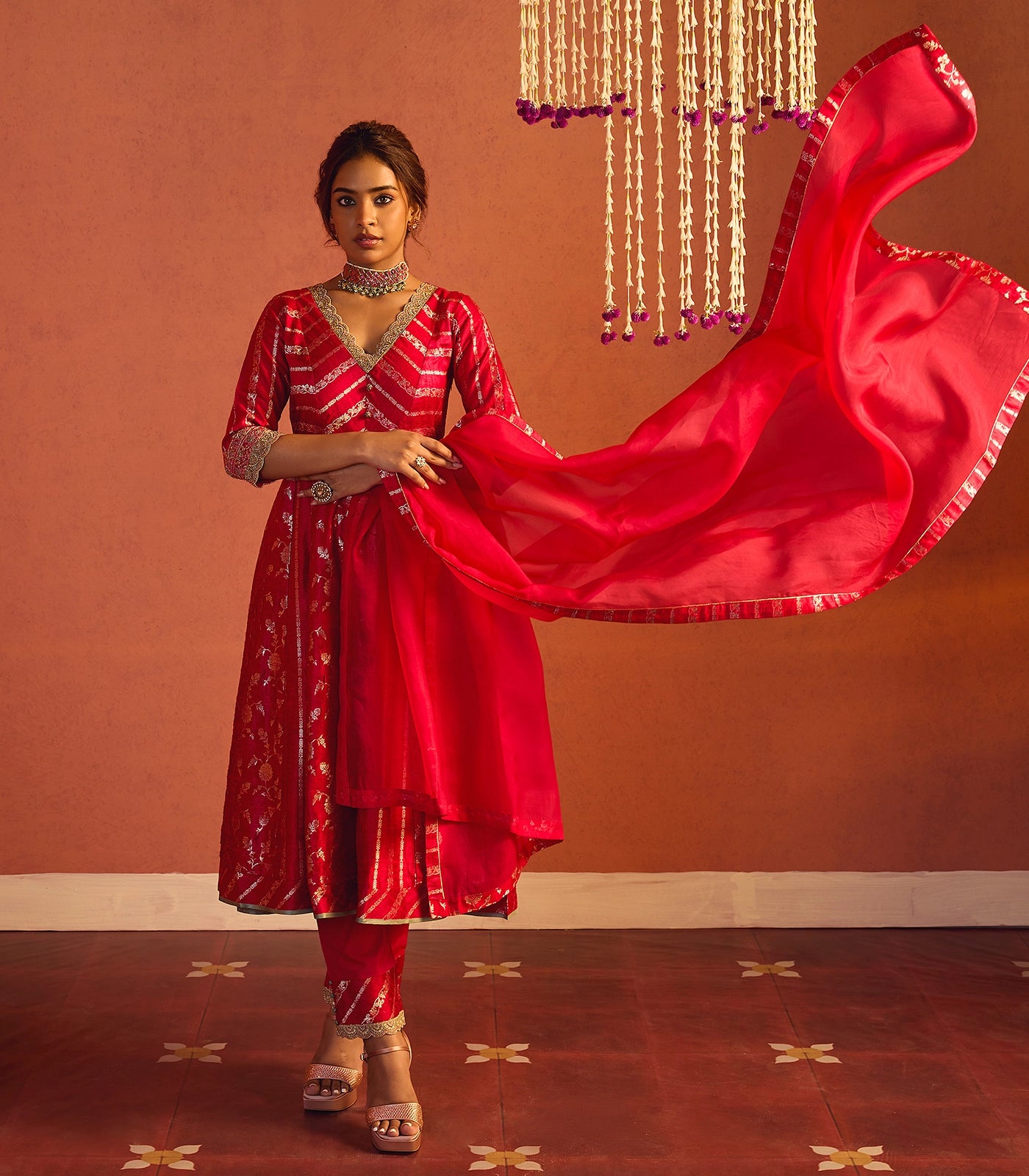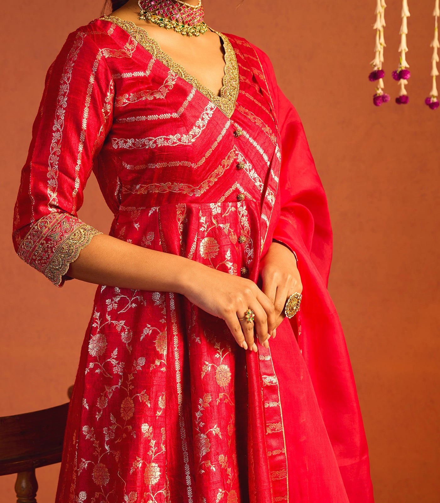 This elegant three-piece Anarkali set is crafted from pure raw silk Banarasi in a striking carmine red shade with strawberry undertones. The bodice features bias-cut striped panels, perfectly mitered at the center front, and adorned with intricate hand-embroidered scalloped detailing using zardozi, cutdana, beads, and sequins.