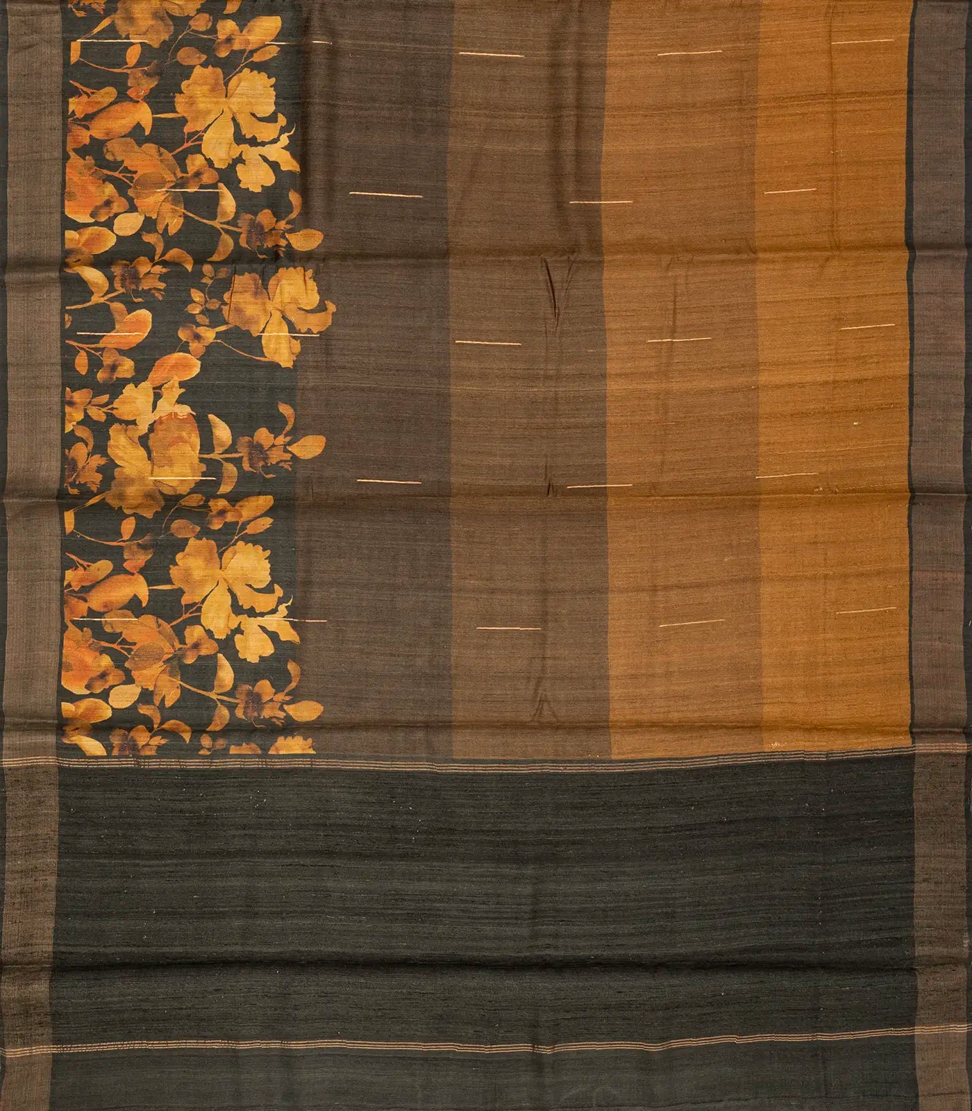 Charcoal Handloom Tussar Silk Saree With Printed Floral Motifs