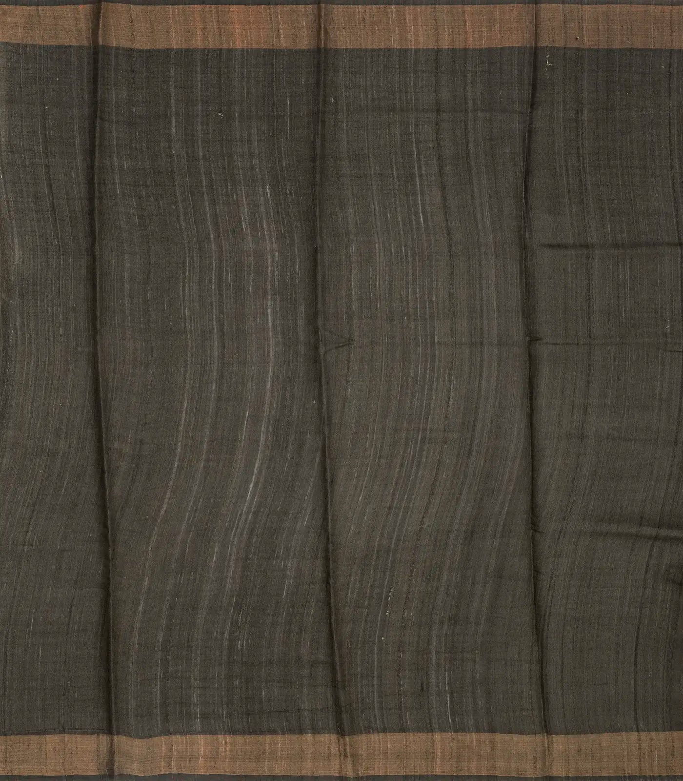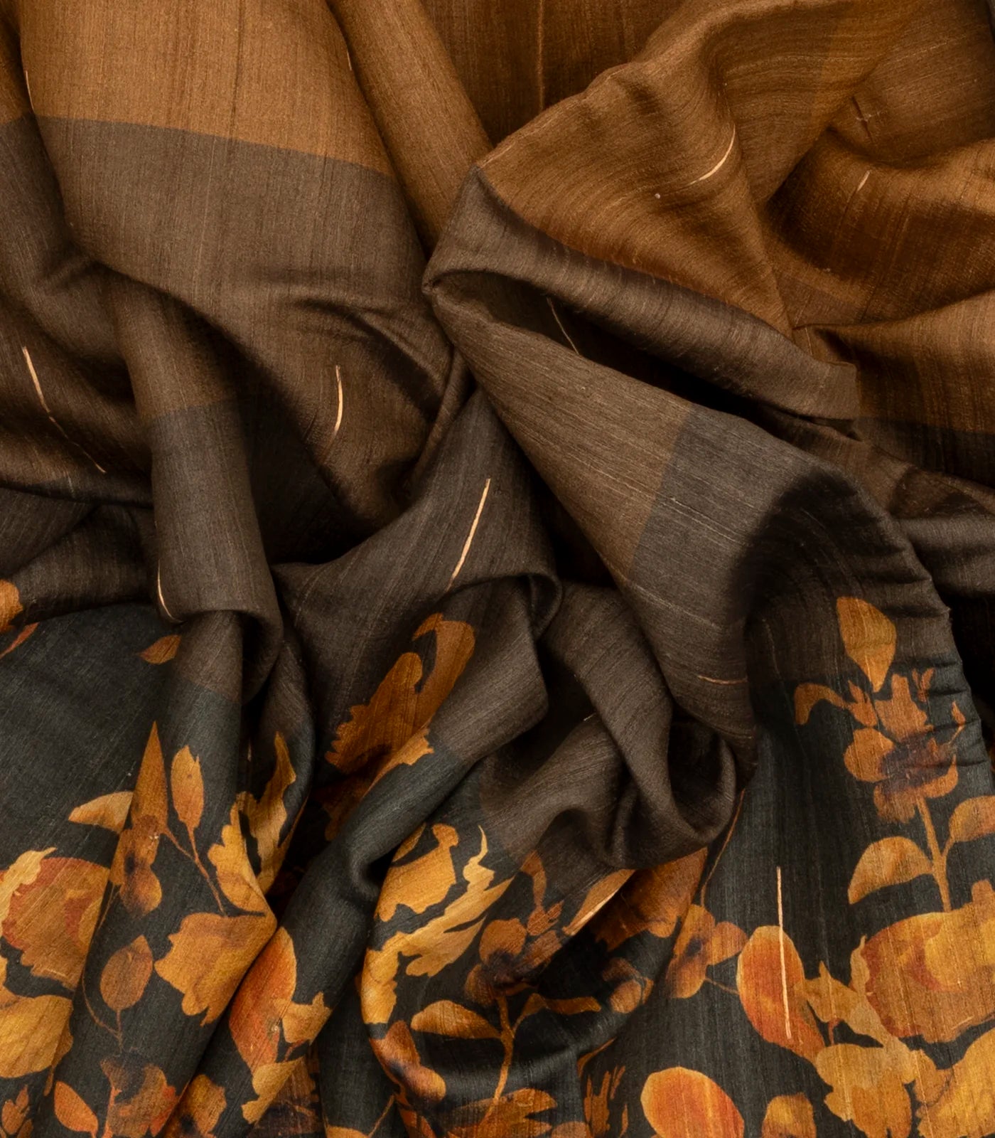 This handwoven tussar silk saree is filled with printed floral motifs in charcoal body along with border and pallu