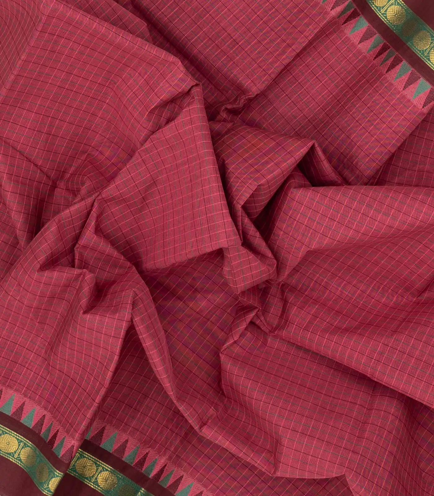 This woven chettinad cotton saree is filled with checks in chestnut pink body along with contrast border and pallu