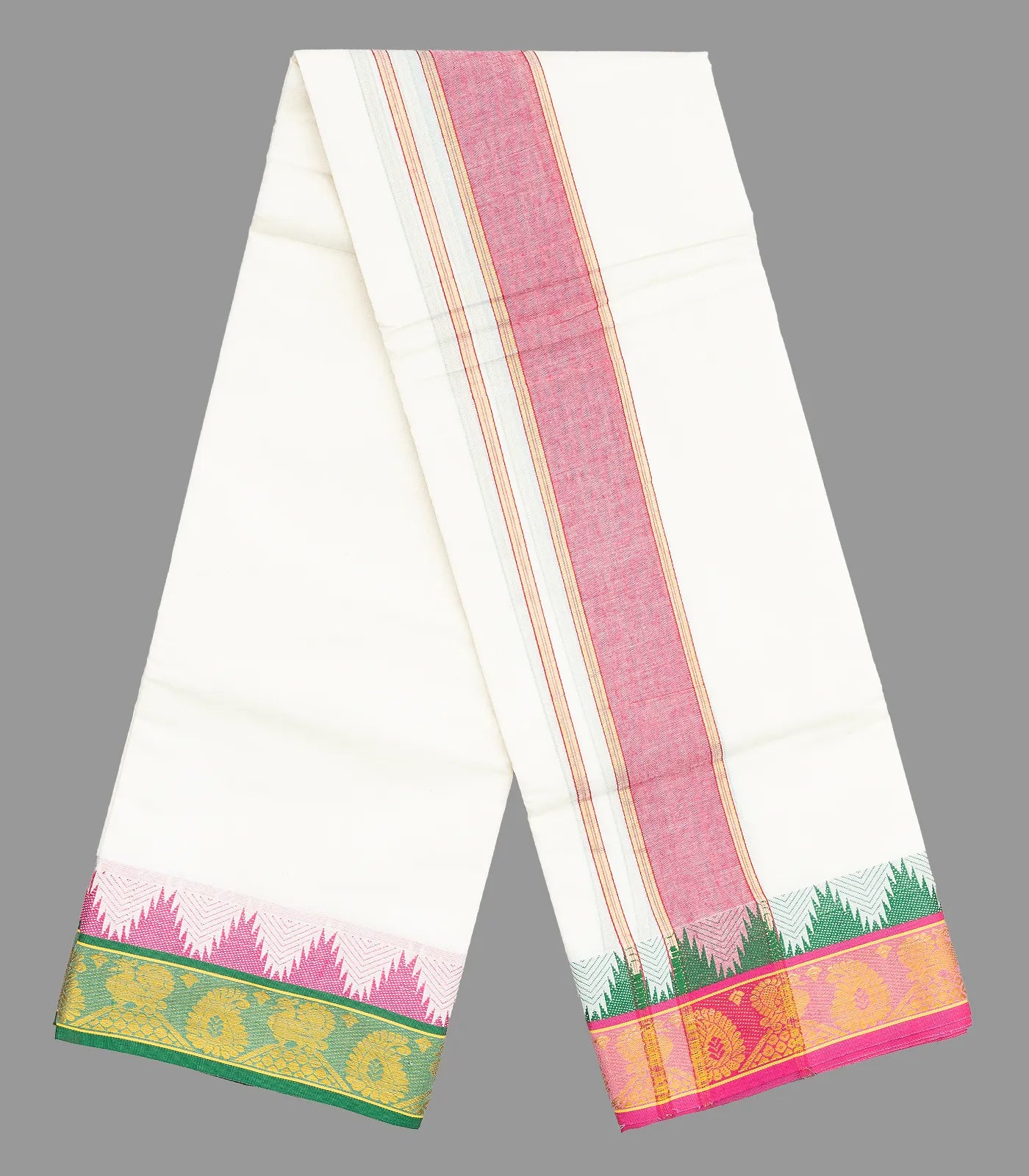 Cream 9 x 5 Cotton Dhoti With Green And Pink Animal Border-CD1509