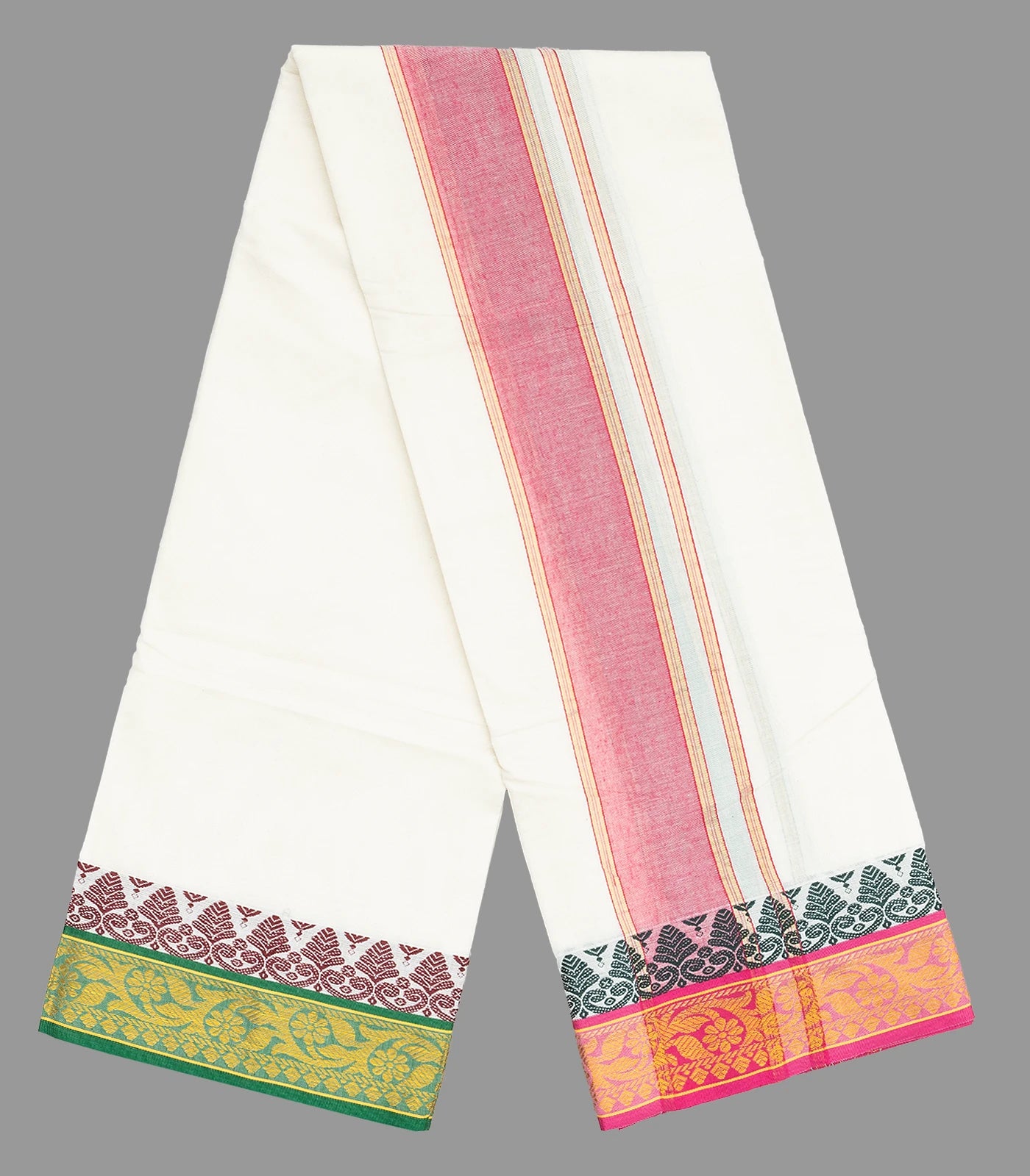 Cream 9 x 5 Cotton Dhoti With Green And Pink Floral Border-CD1508