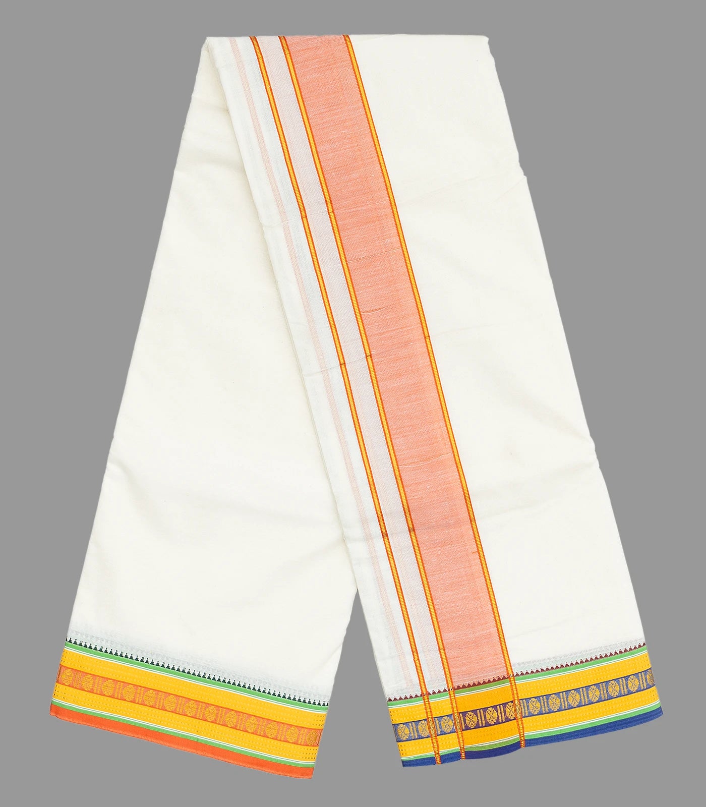 Cream 9 x 5 Cotton Dhoti With Yellow And Blue Zari Thread Border-CD1505