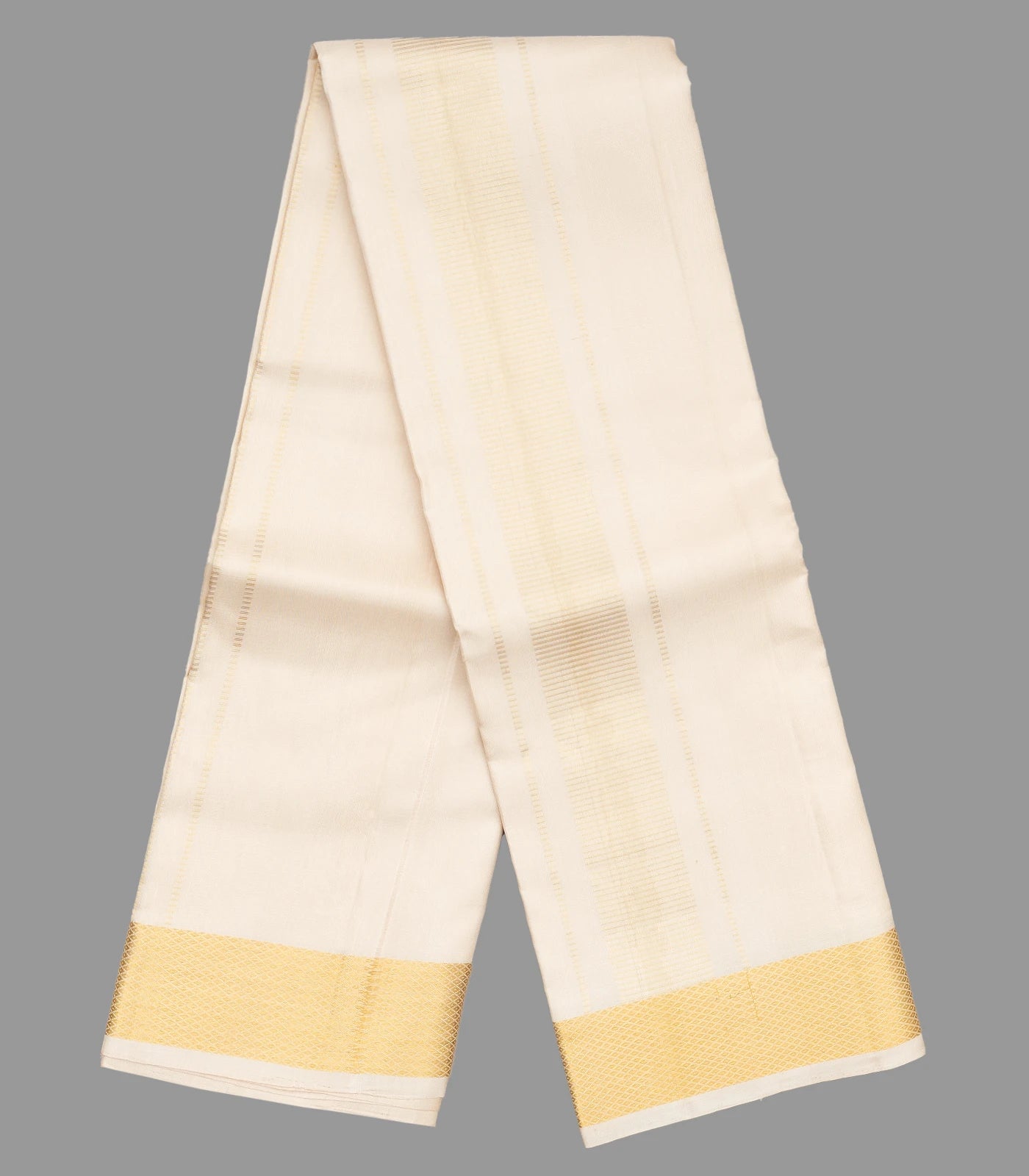 This handwoven silk dhoti with 8 yards and 4 yards angavastram in cream along with matching 2 meter shirt material