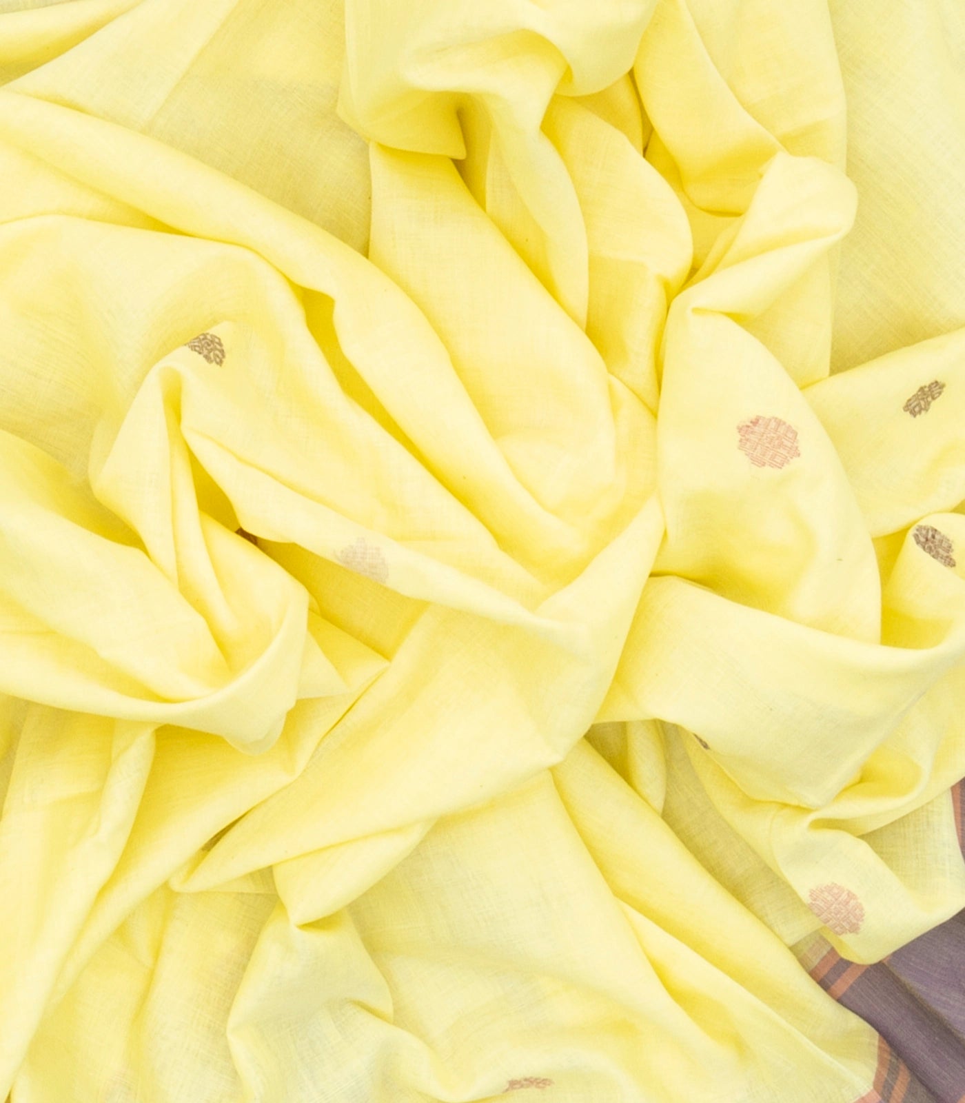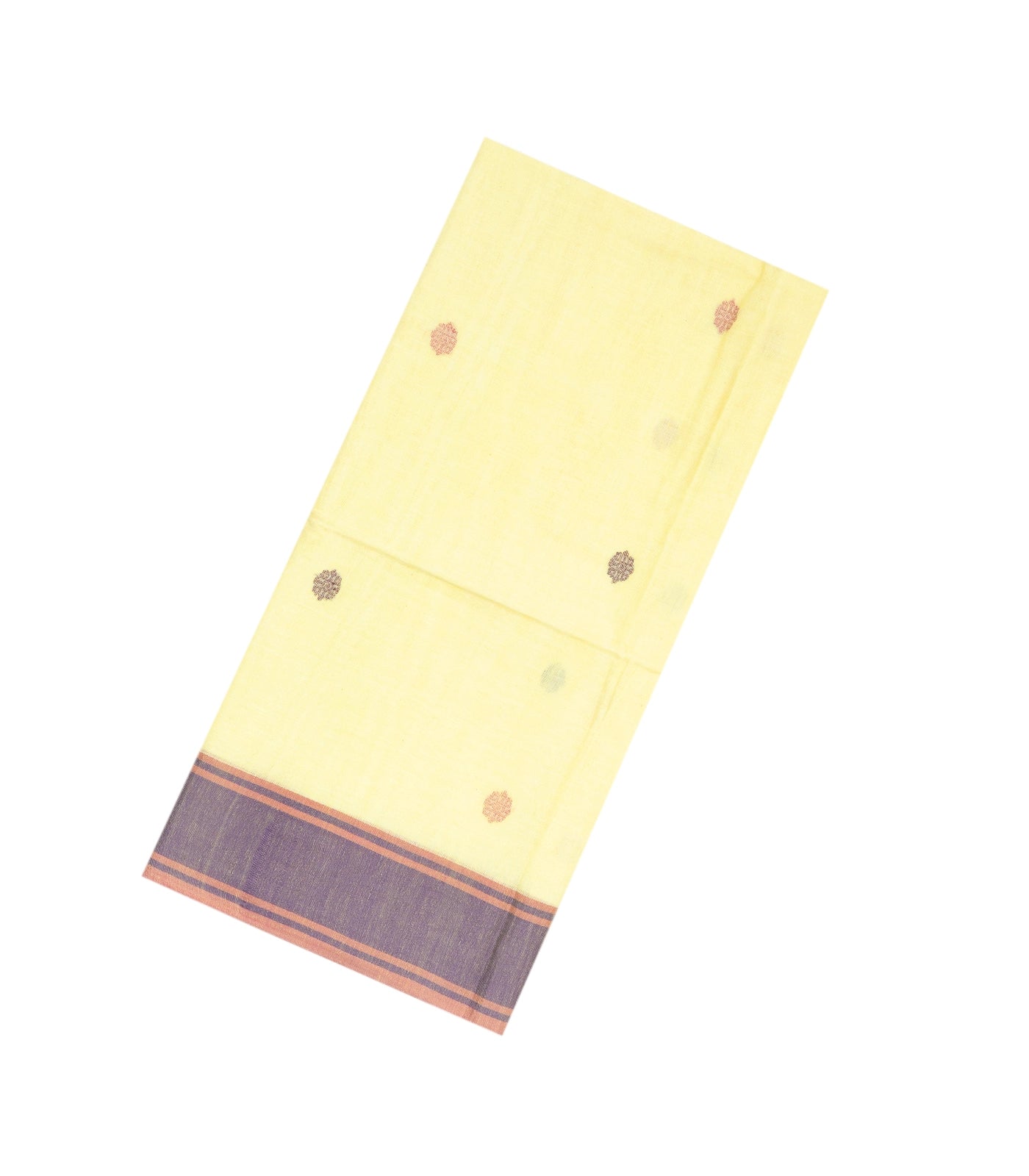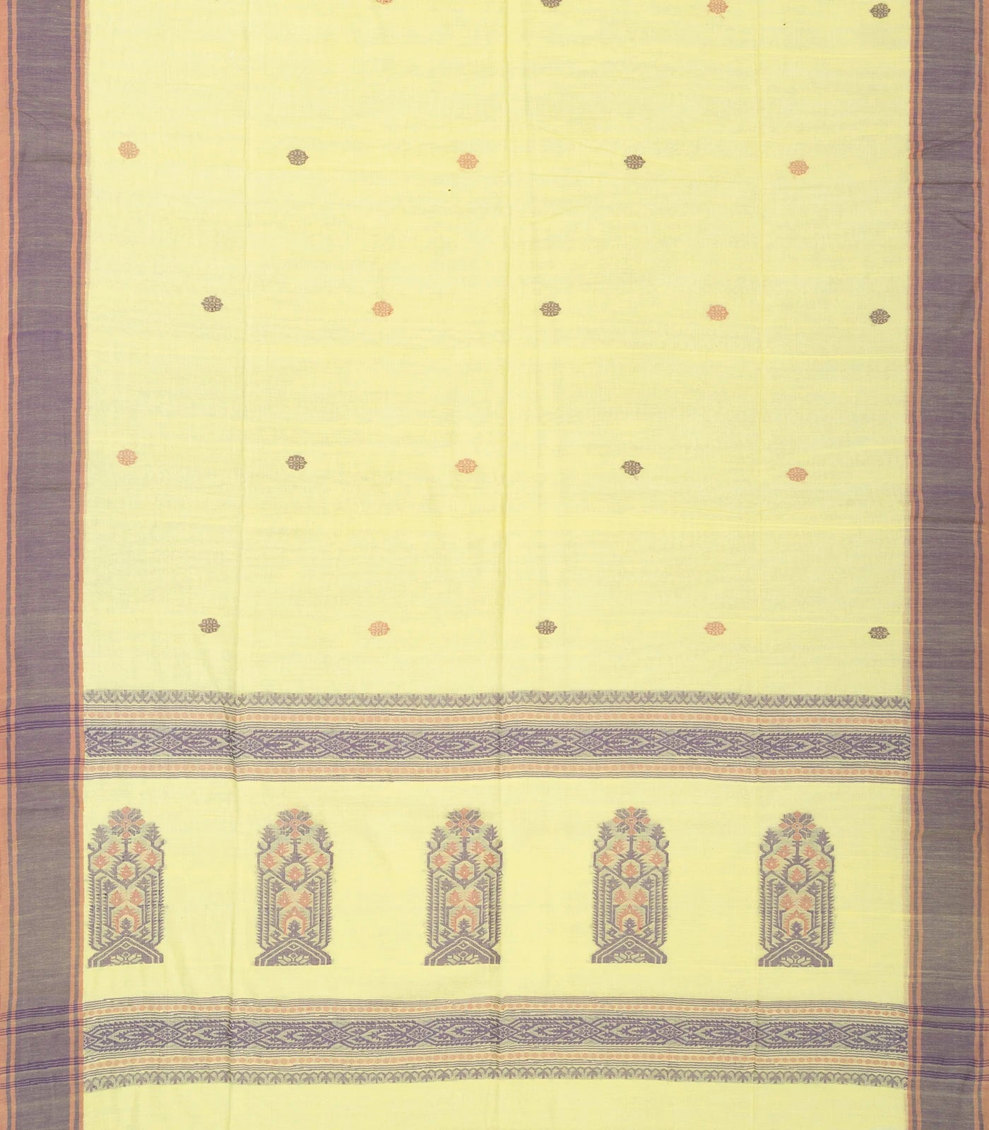 This handwoven bengal cotton saree is filled with floral buttas in cream body along with contrast border and floral pallu