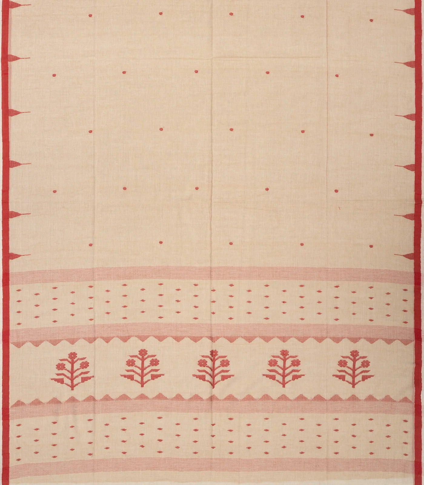 This handwoven bengal cotton saree is filled with coin buttas in cream body along with temple border and pallu