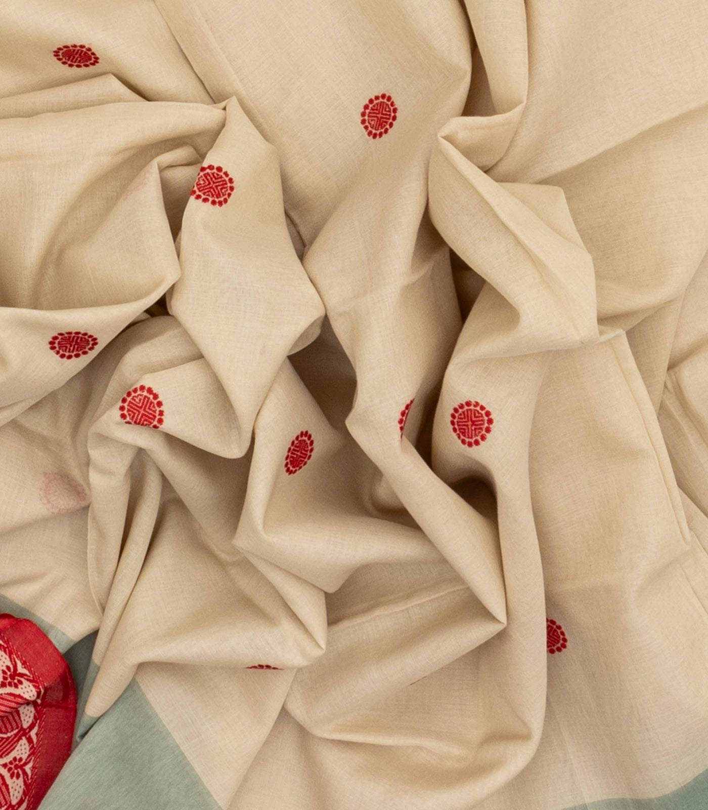 This handwoven bengal cotton saree is filled with rudraksham buttas in cream body along with contrast crimson border and pallu