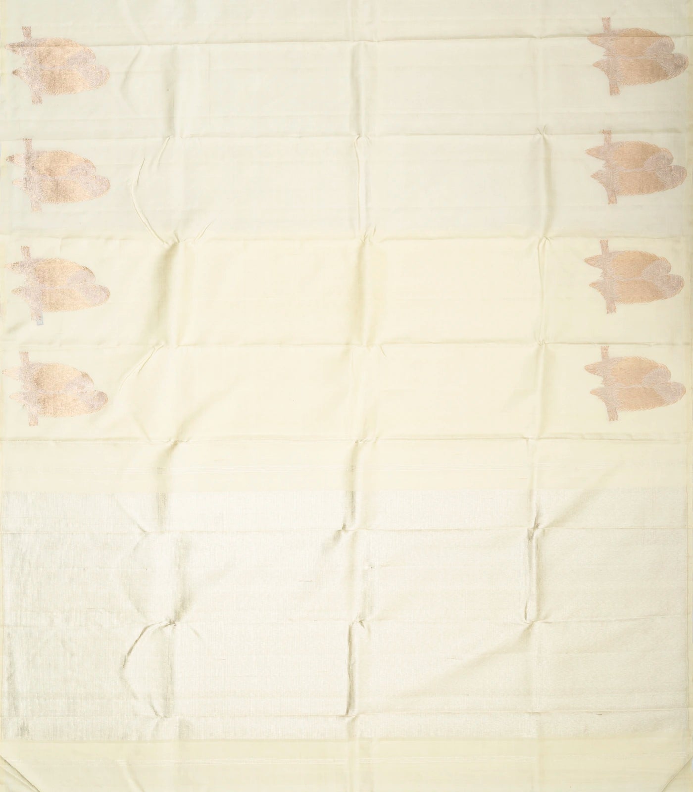 This handwoven kanchipuram silk saree is filled with plain cream body along with bird motifs in border and pallu