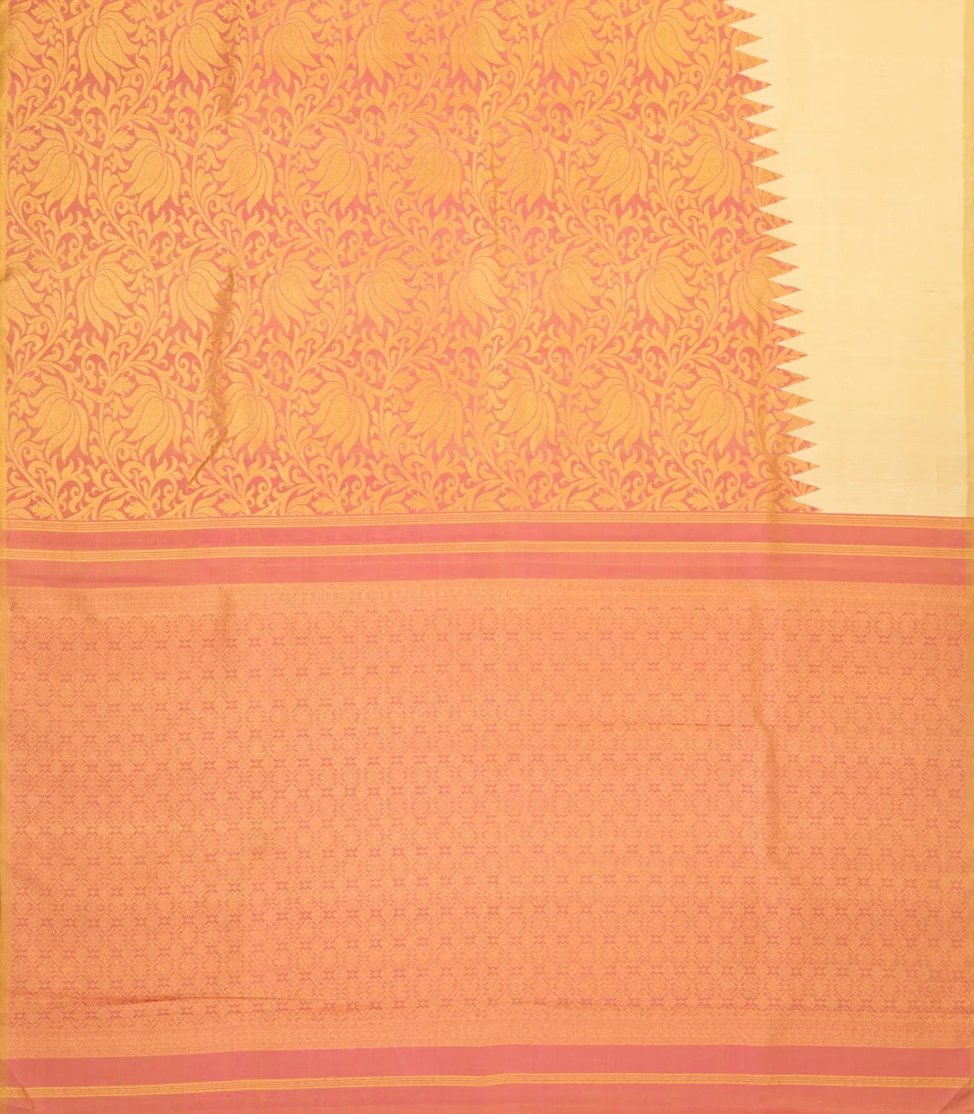 This handwoven kanchipuram silk saree is filled with plain crema body along with floral motifs in rising contrast border along with pallu