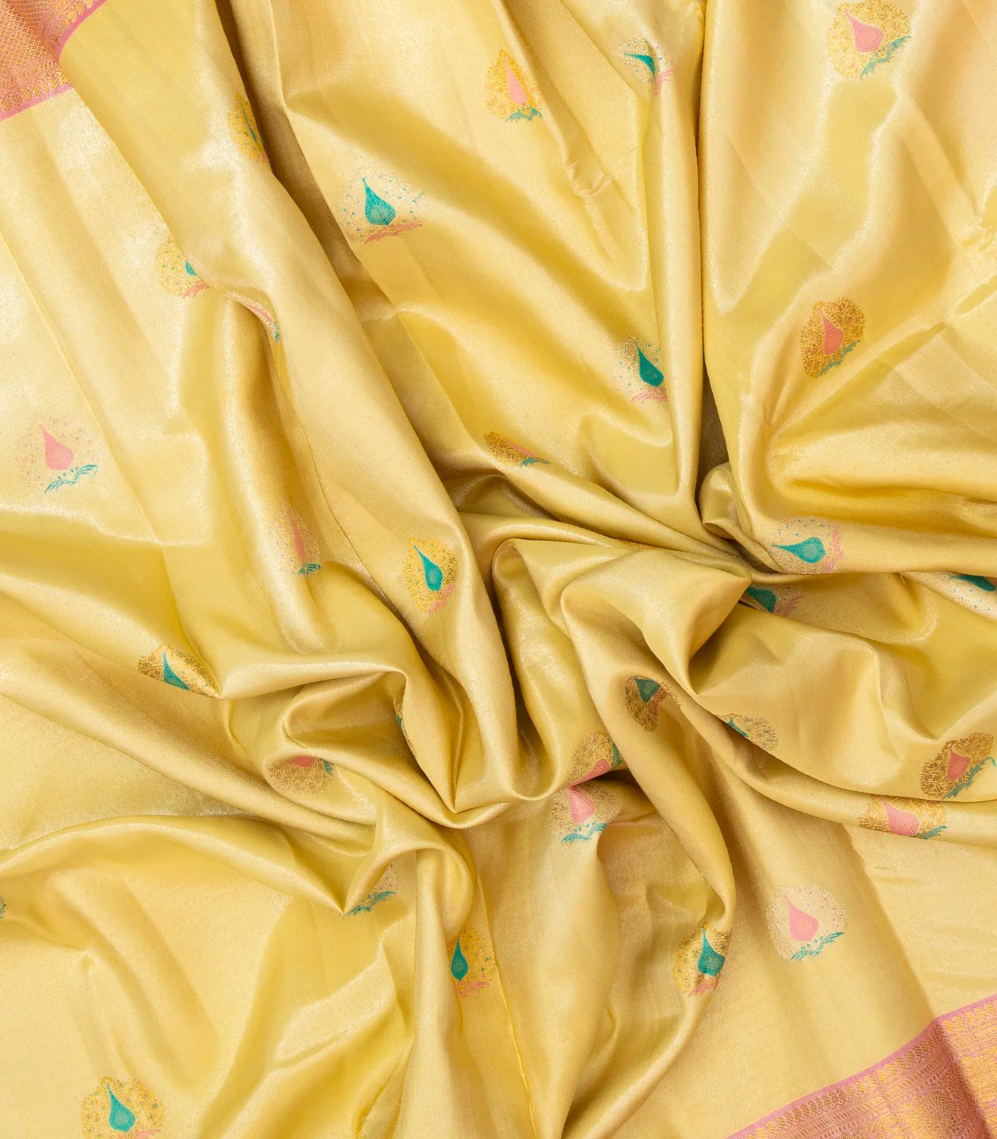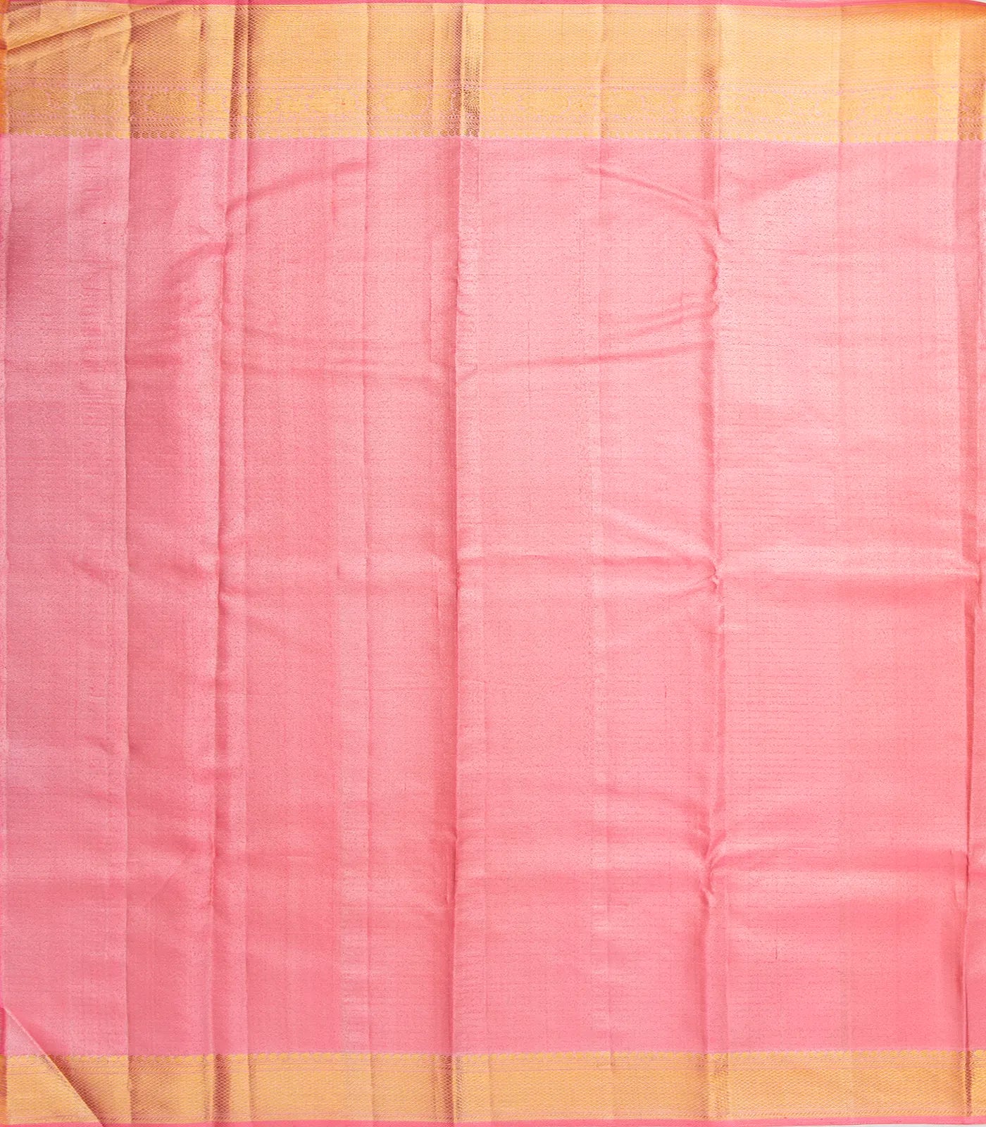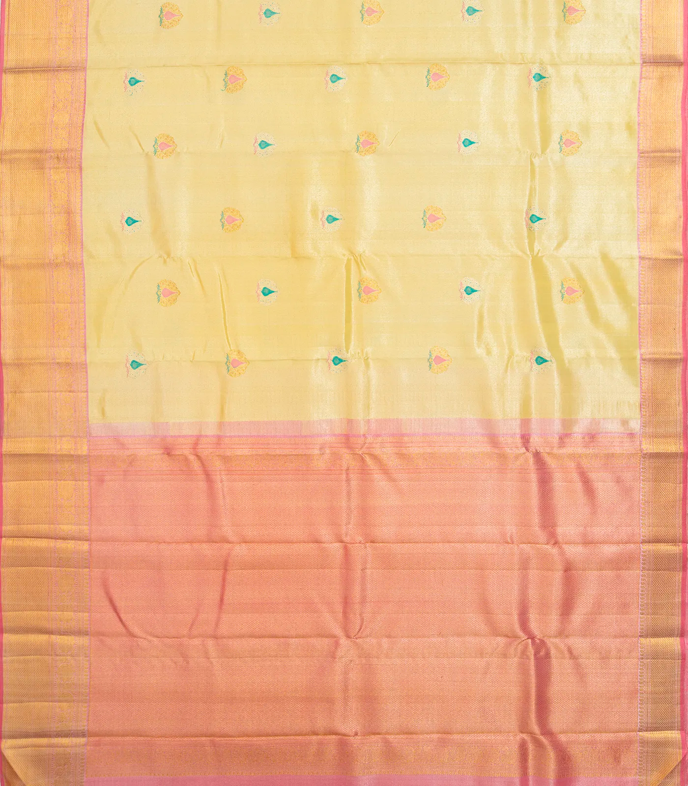 This handwoven korvai kanchipuram silk saree is filled with meena floral buttas in cream body along with contrast dusty pink border and pallu