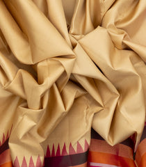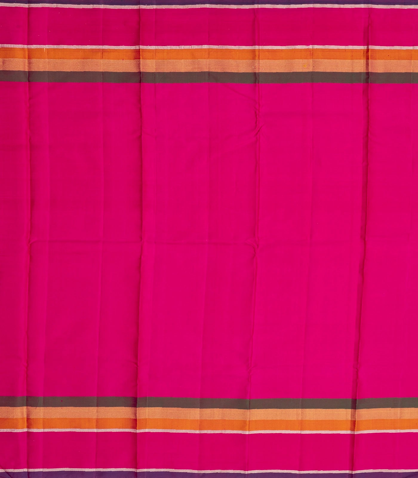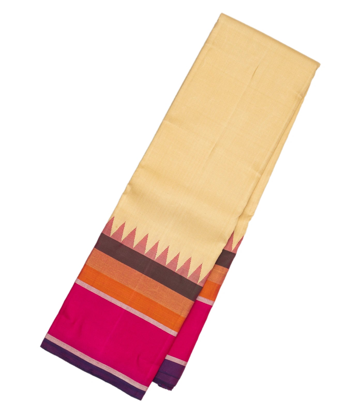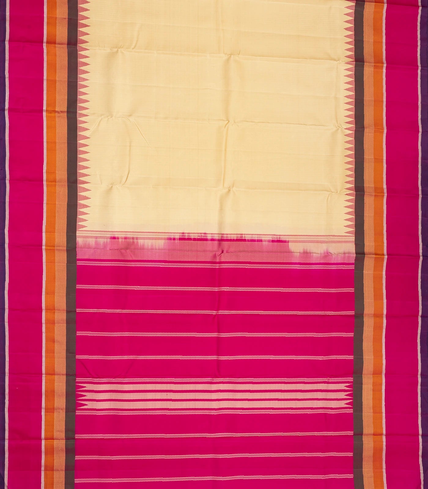 This handwoven korvai kanchipuram silk saree with plain cream body along with contrast pink temple border and pallu