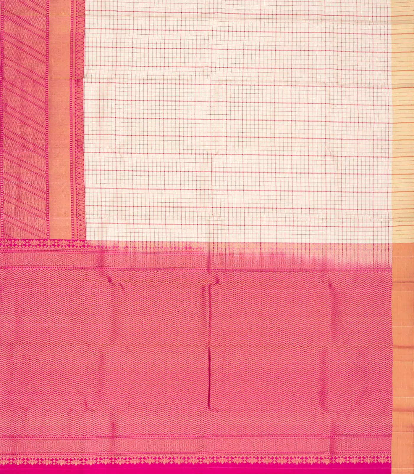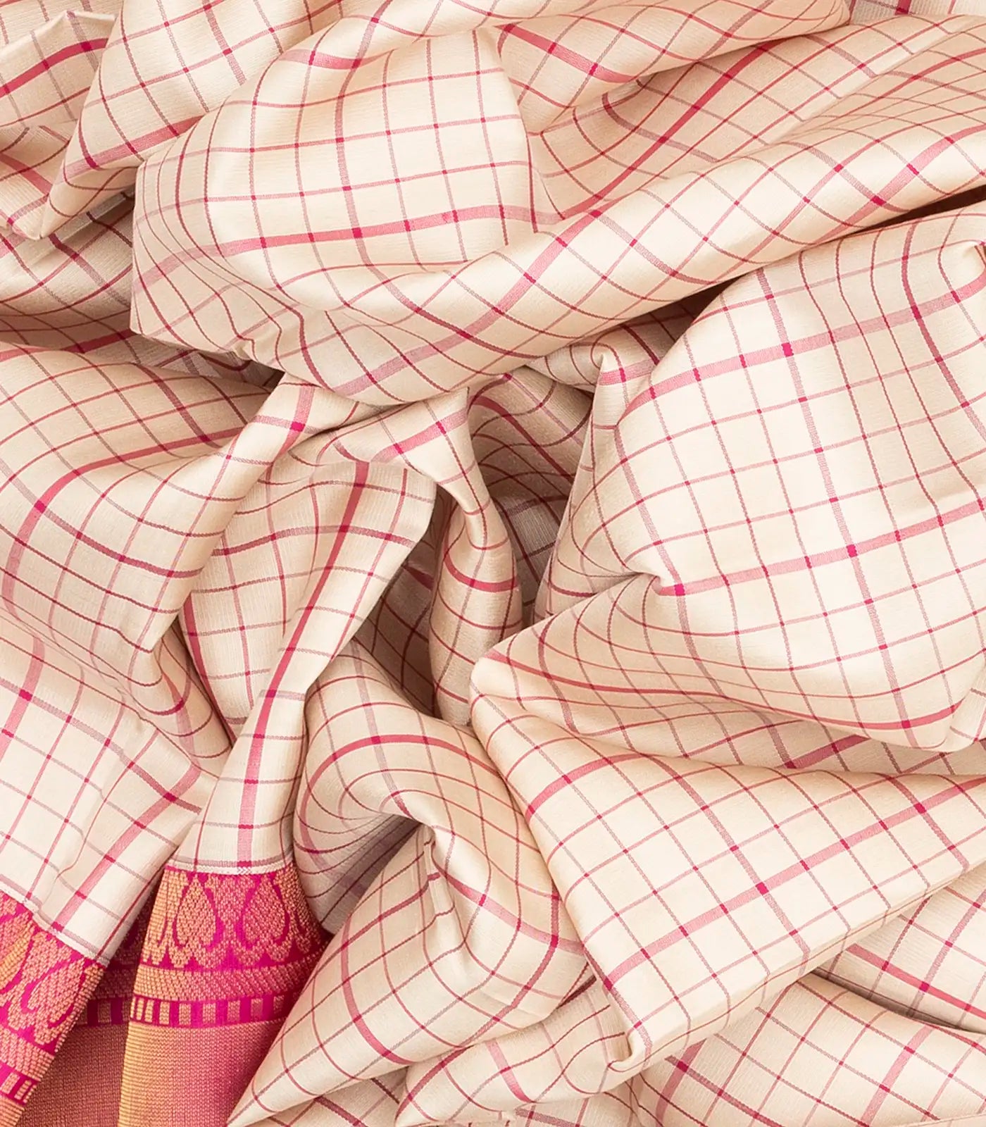 This handwoven soft silk saree is filled with checks in cream body along with chevron motifs in border and pallu