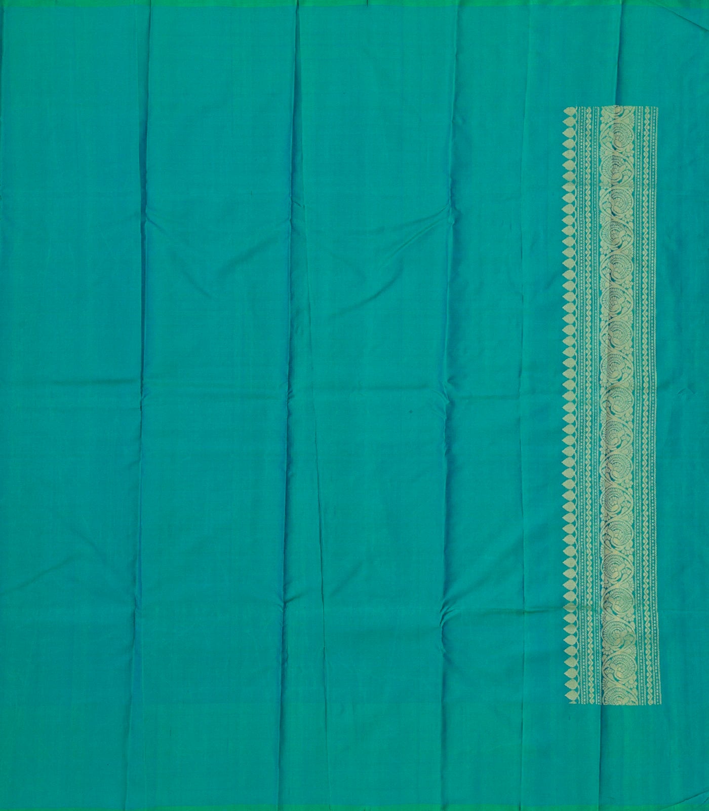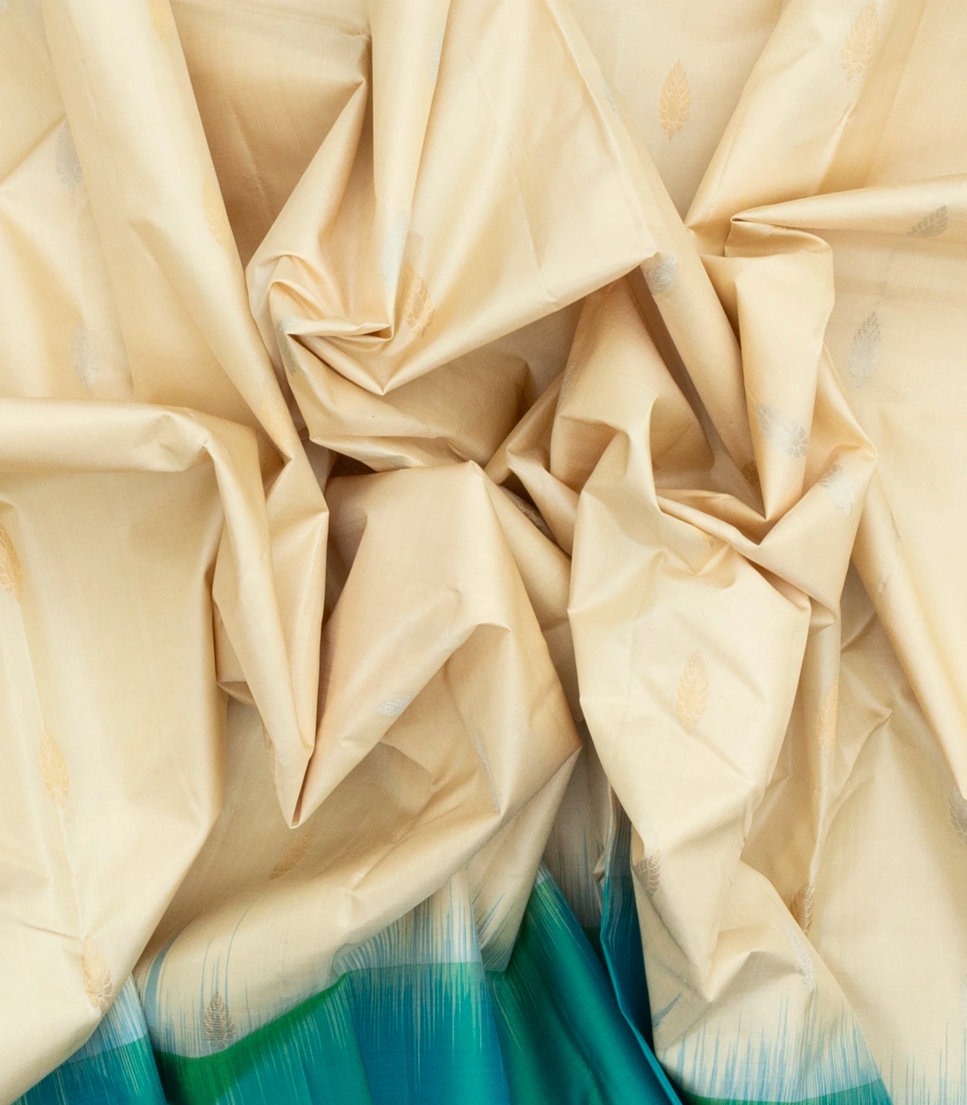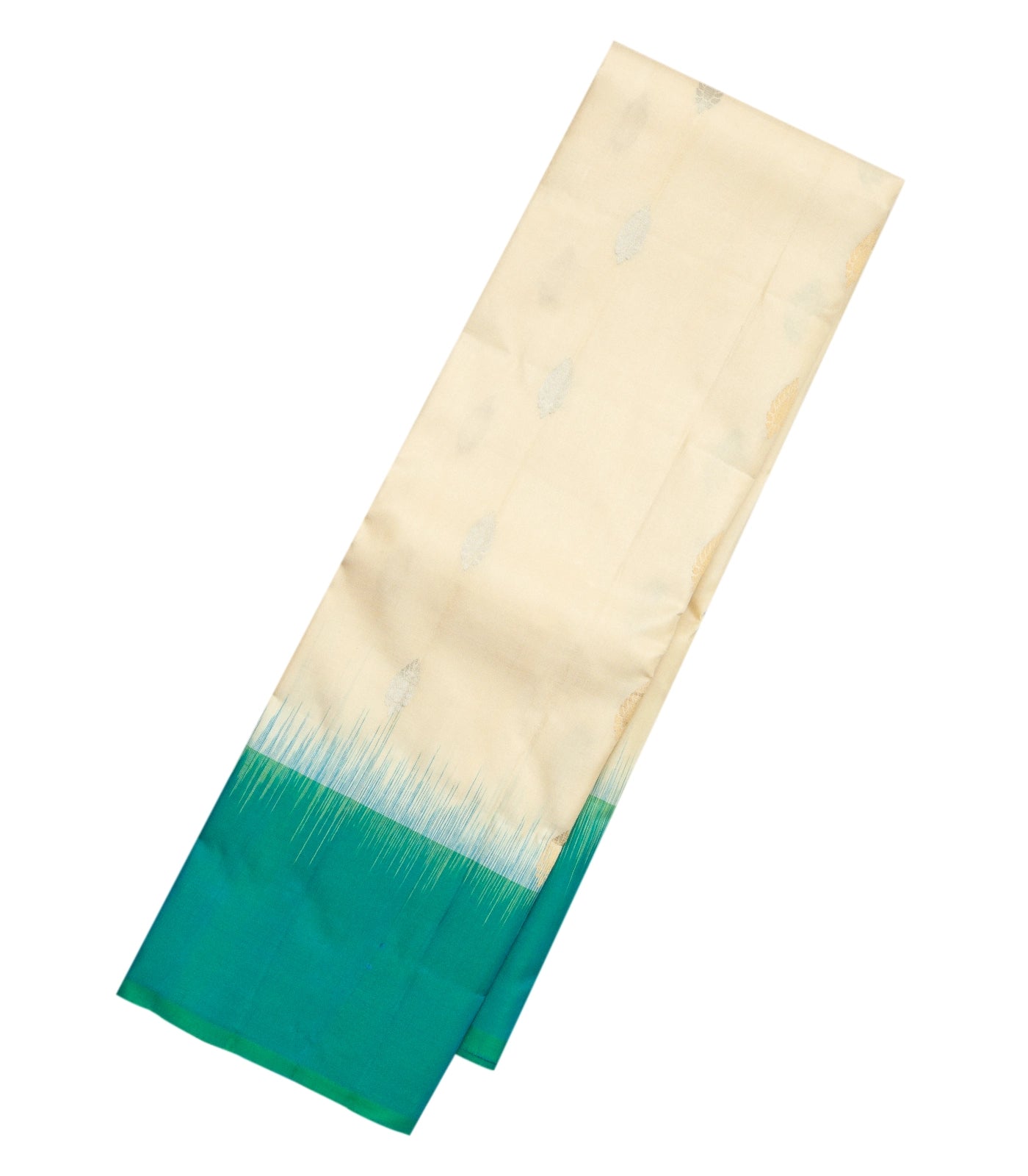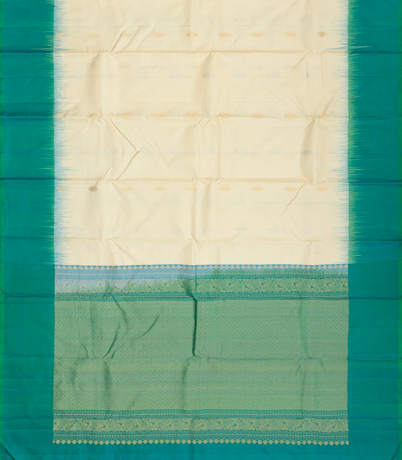 This handwoven soft silk saree is filled with floral zari buttas in cream body along with contrast sea green border and pallu