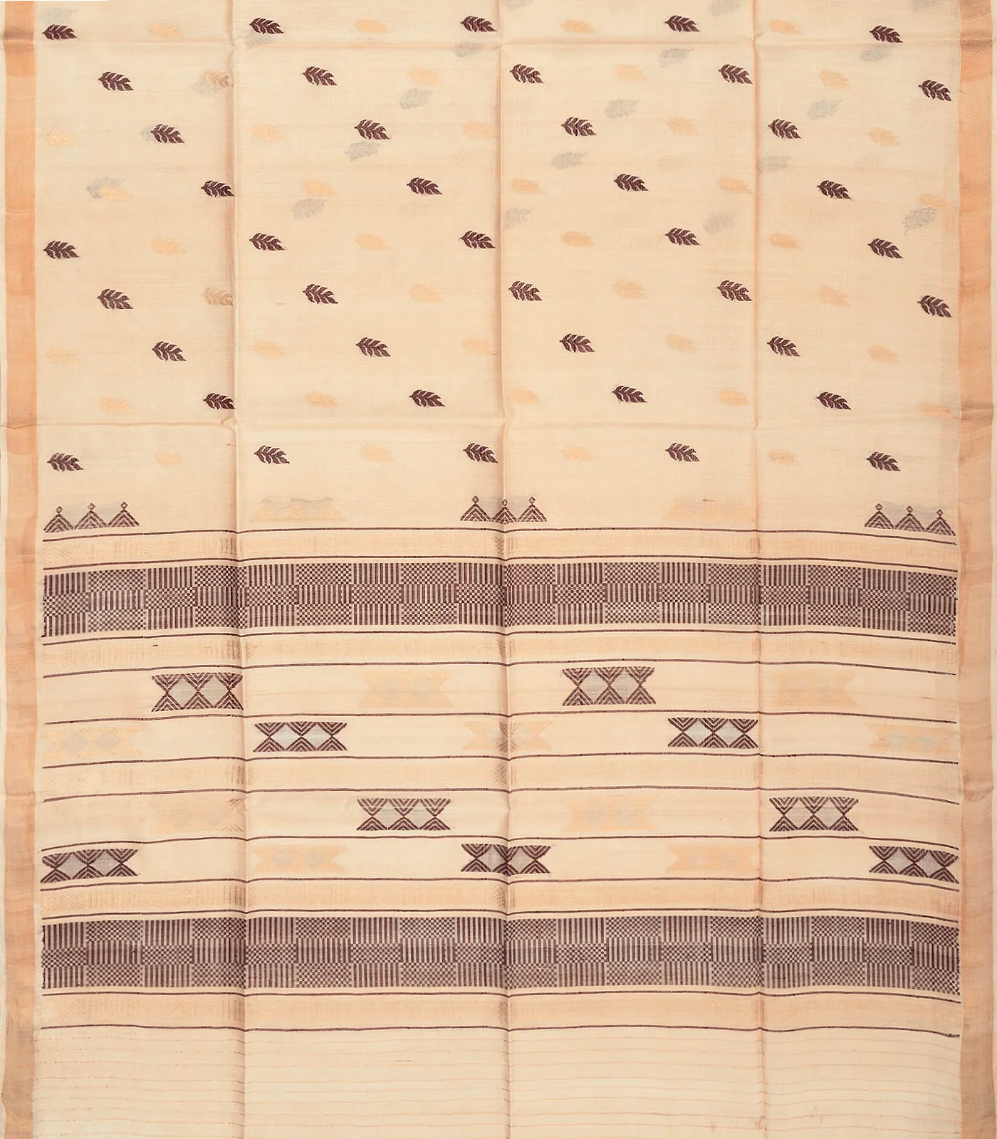 This handwoven tussar silk saree is filled with floral buttas in cream body along with zari border and pallu