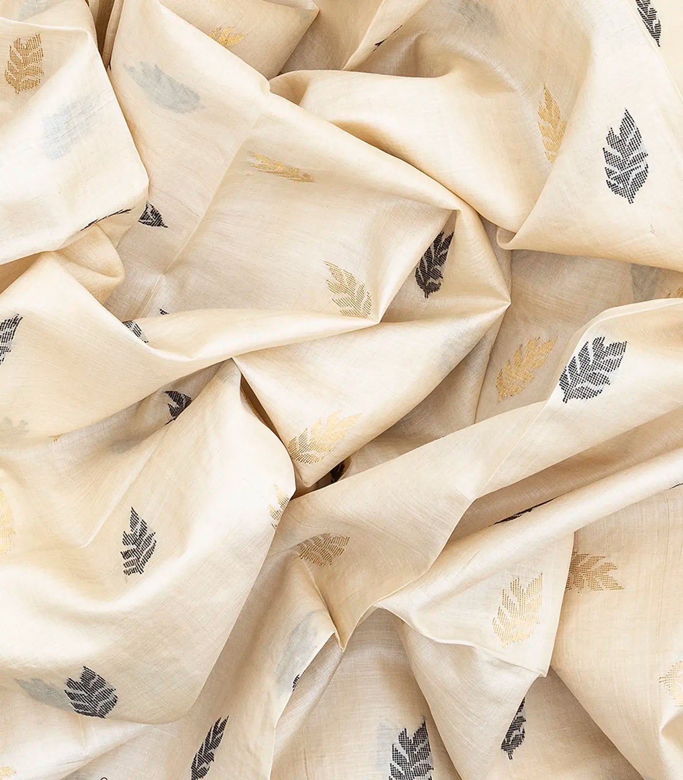 This handwoven tussar silk saree is filled with floral motifs in cream body along with border and pallu