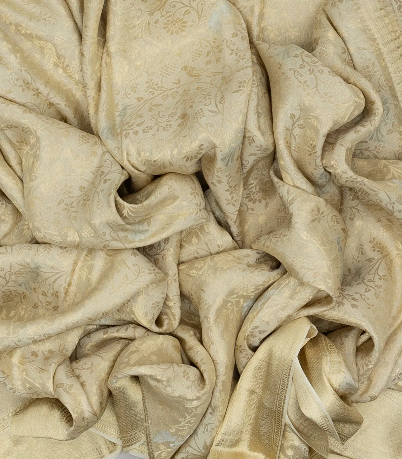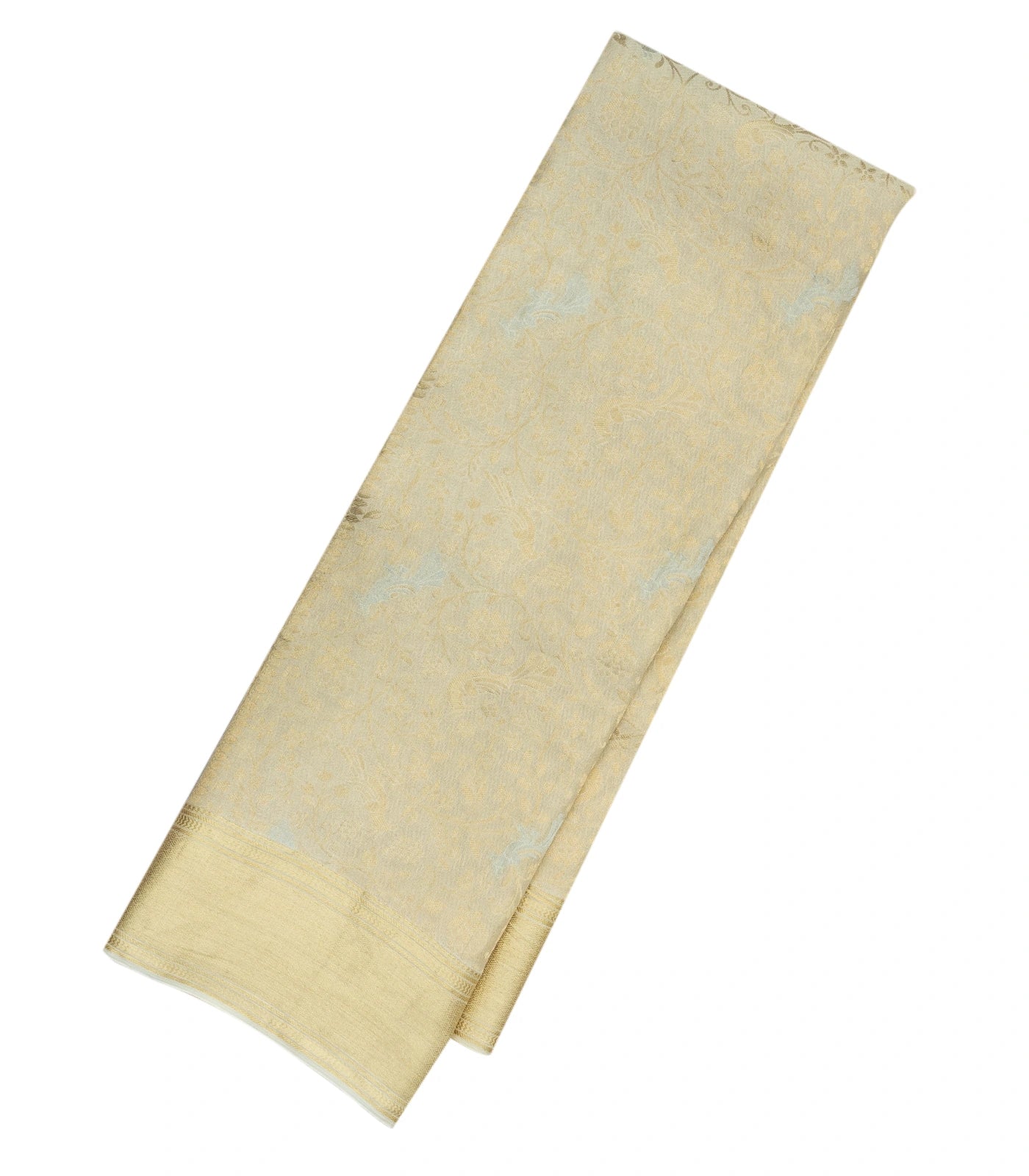 This woven mysore crepe silk saree is filled with peacock floral motifs in cream body along with zari border and pallu