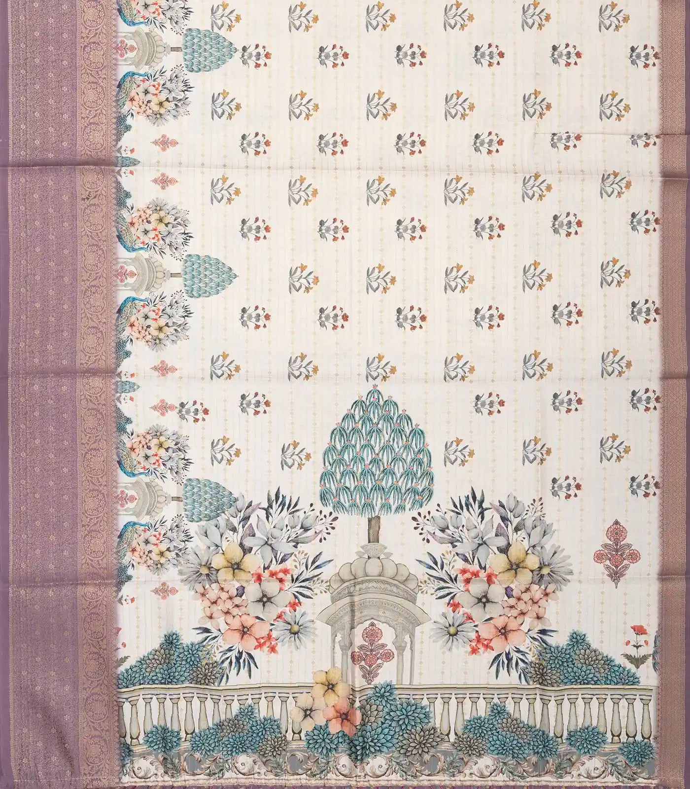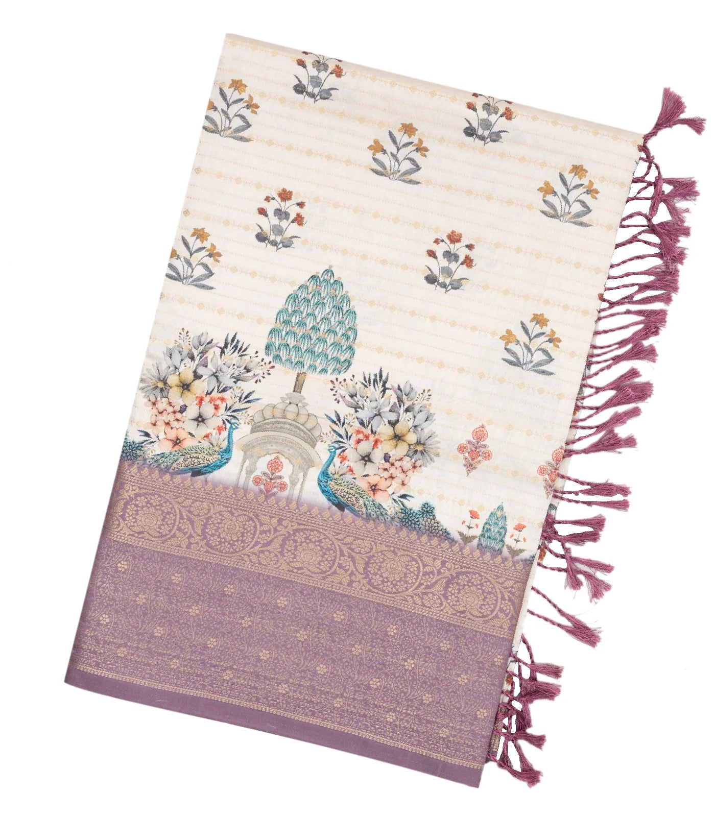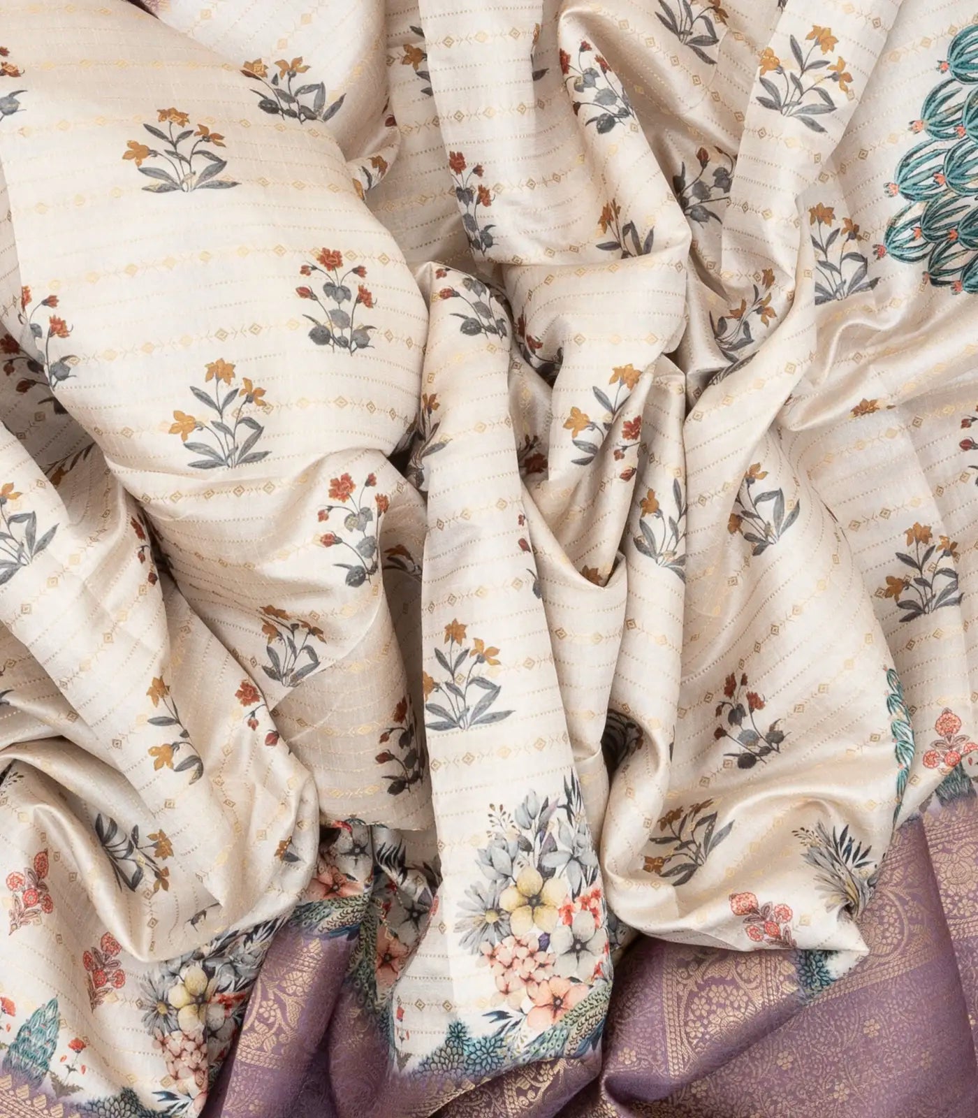 This woven art tussar saree is filled with printed floral motifs in cream body along with contrast border and pallu
