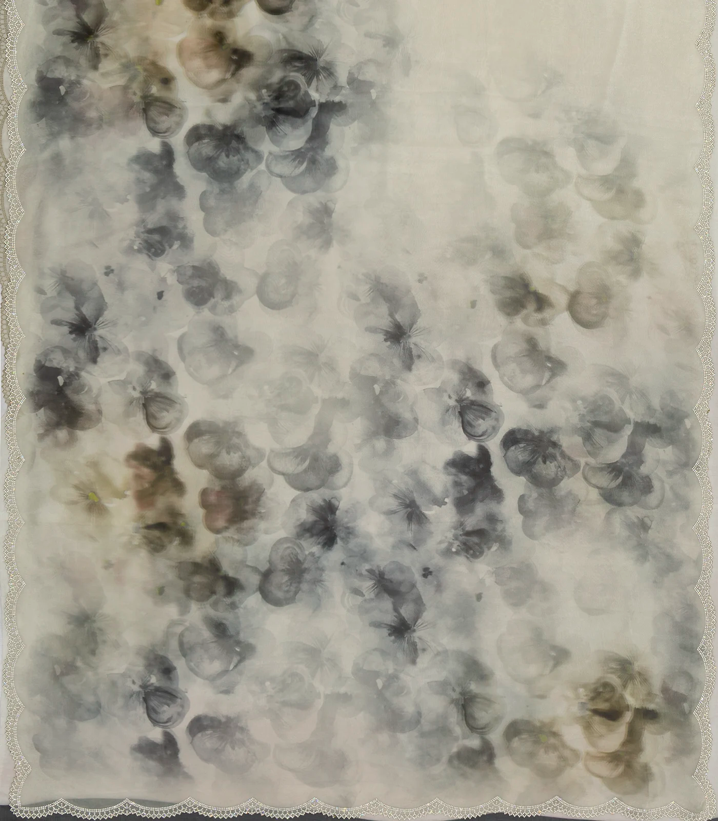 This woven blended chiffon saree is filled with printed floral motifs in cream body along with embroidered selvage & pallu