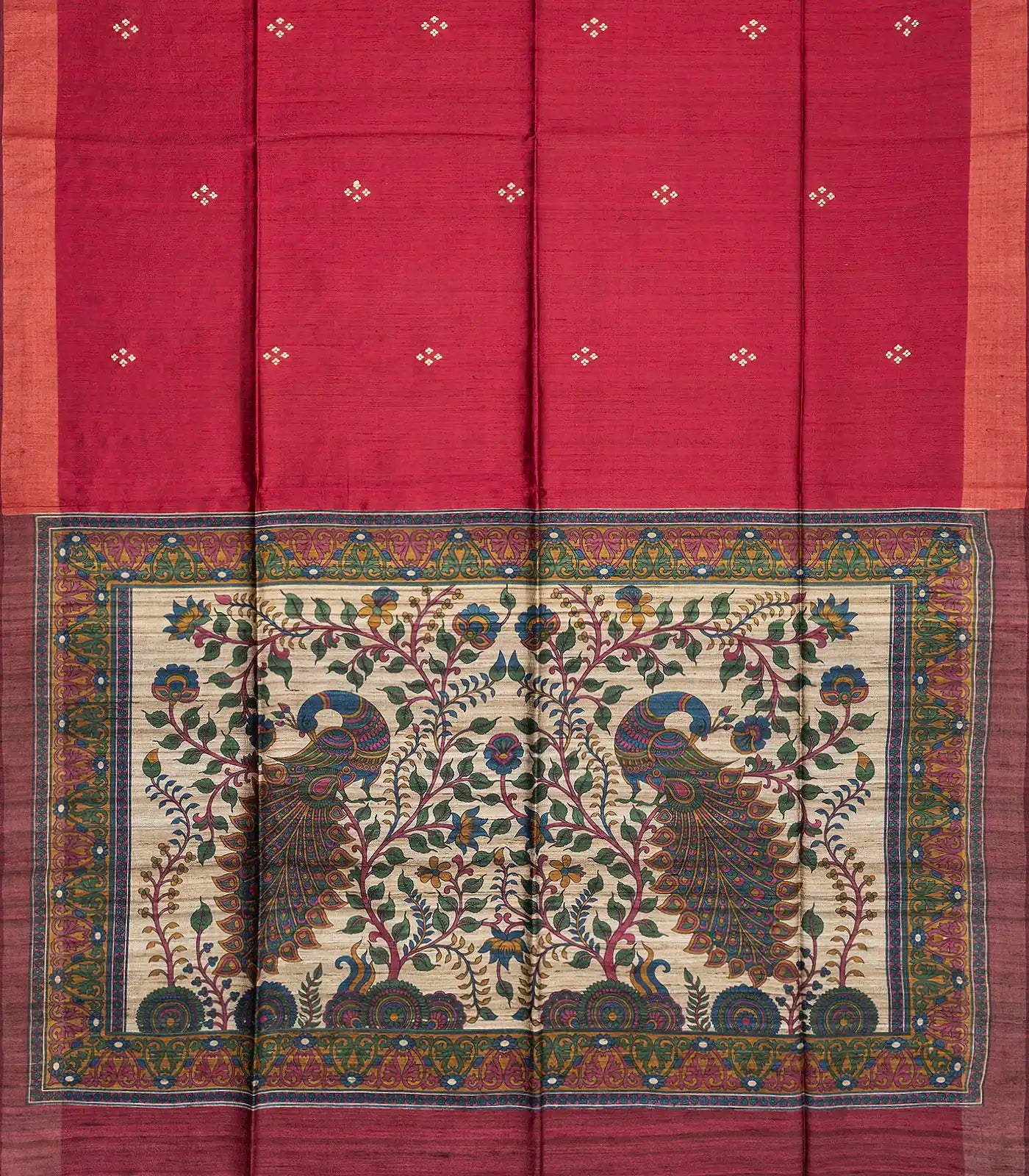 Crimson Handloom Dupion Silk Saree With Printed Bird Pallu-DS0493
