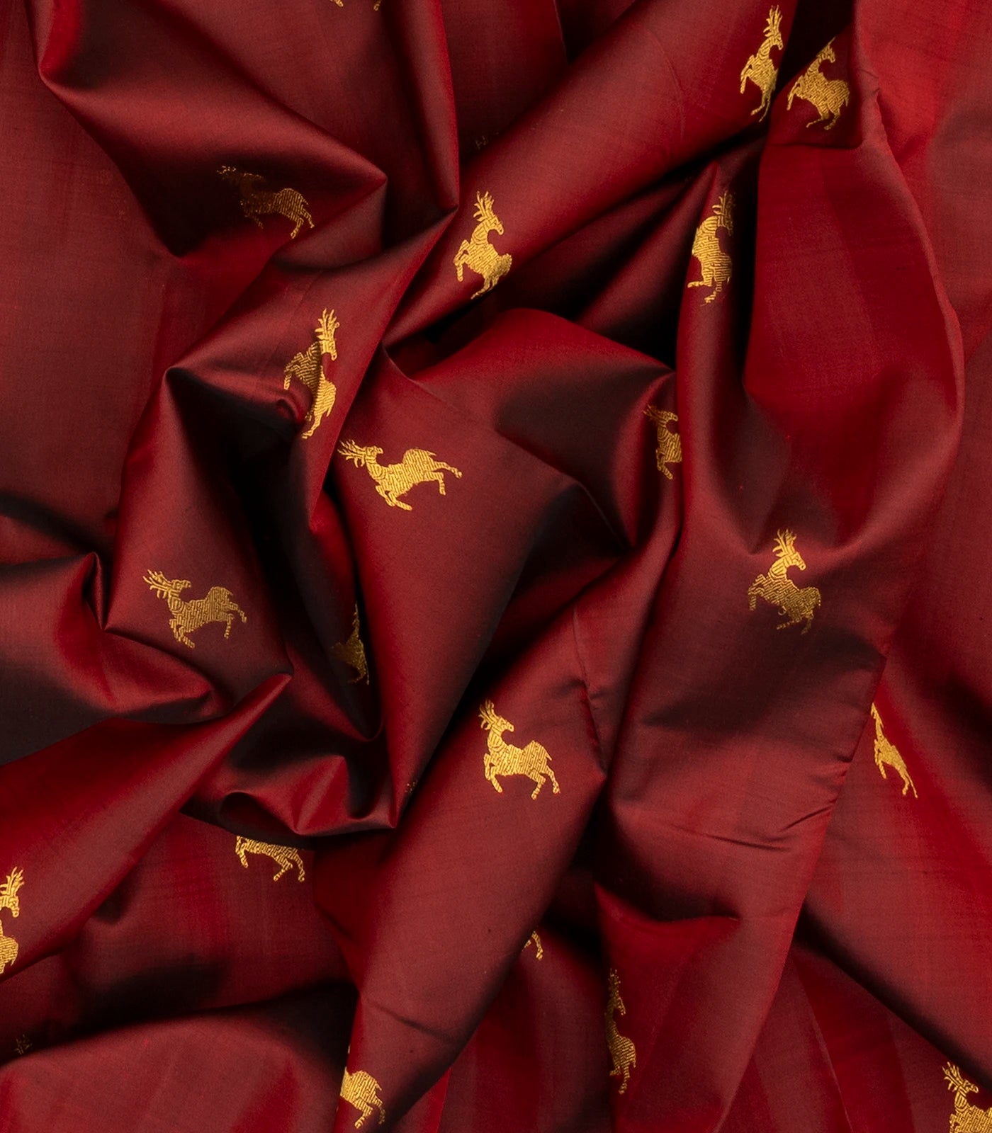 Crimson Handloom Kanchipuram Silk Saree With Deer Zari Buttas