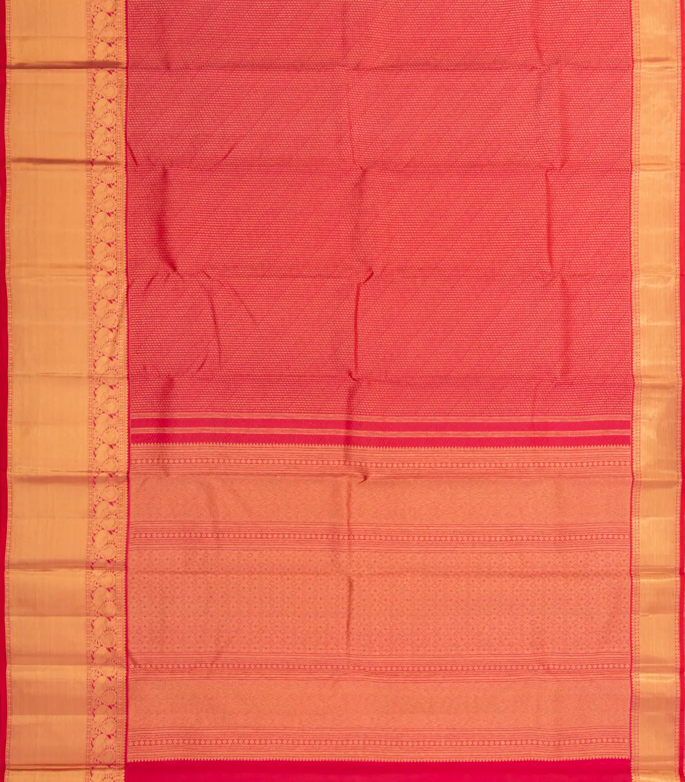 This handwoven kanchipuram silk saree is filled with dotted motifs in crimson body along with zari border and pallu
