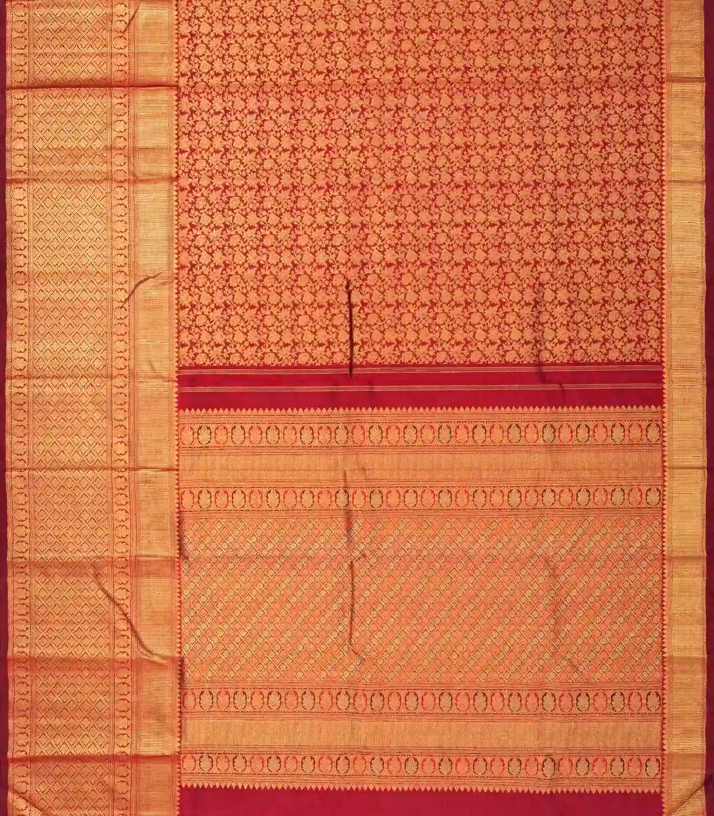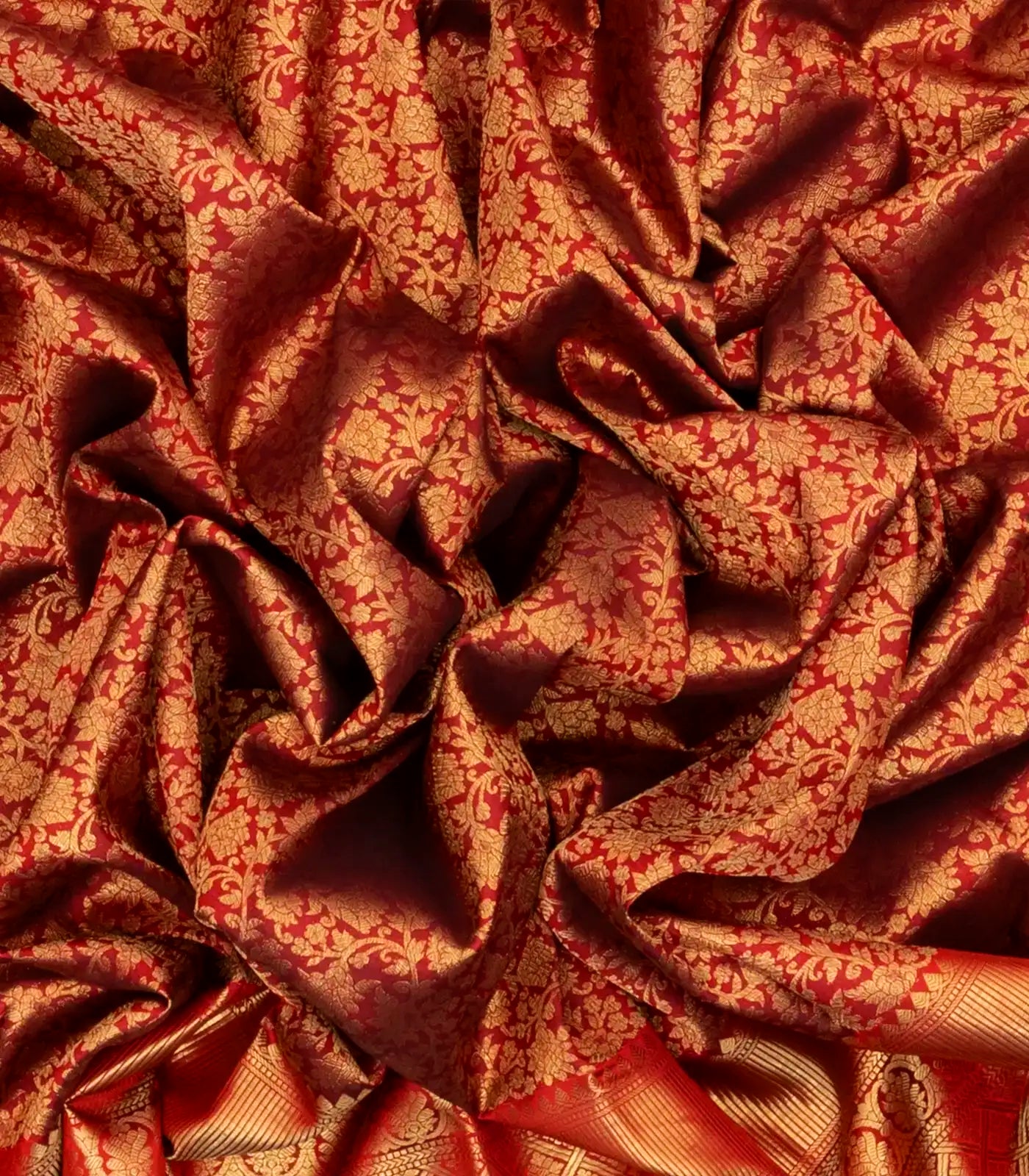 This handwoven kanchipuram silk saree is filled with floral vine motifs in crimson body along with zari border and pallu