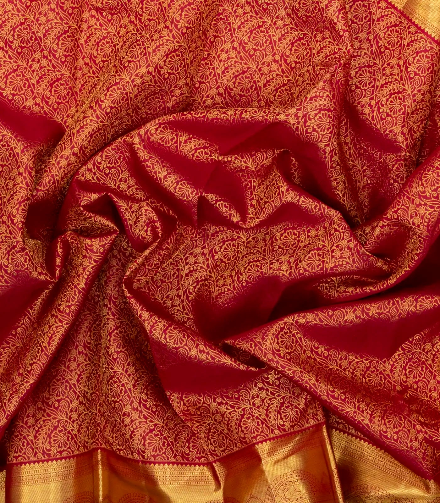 This handwoven kanchipuram silk saree is filled with floral vine motifs in crimson body along with zari border and pallu