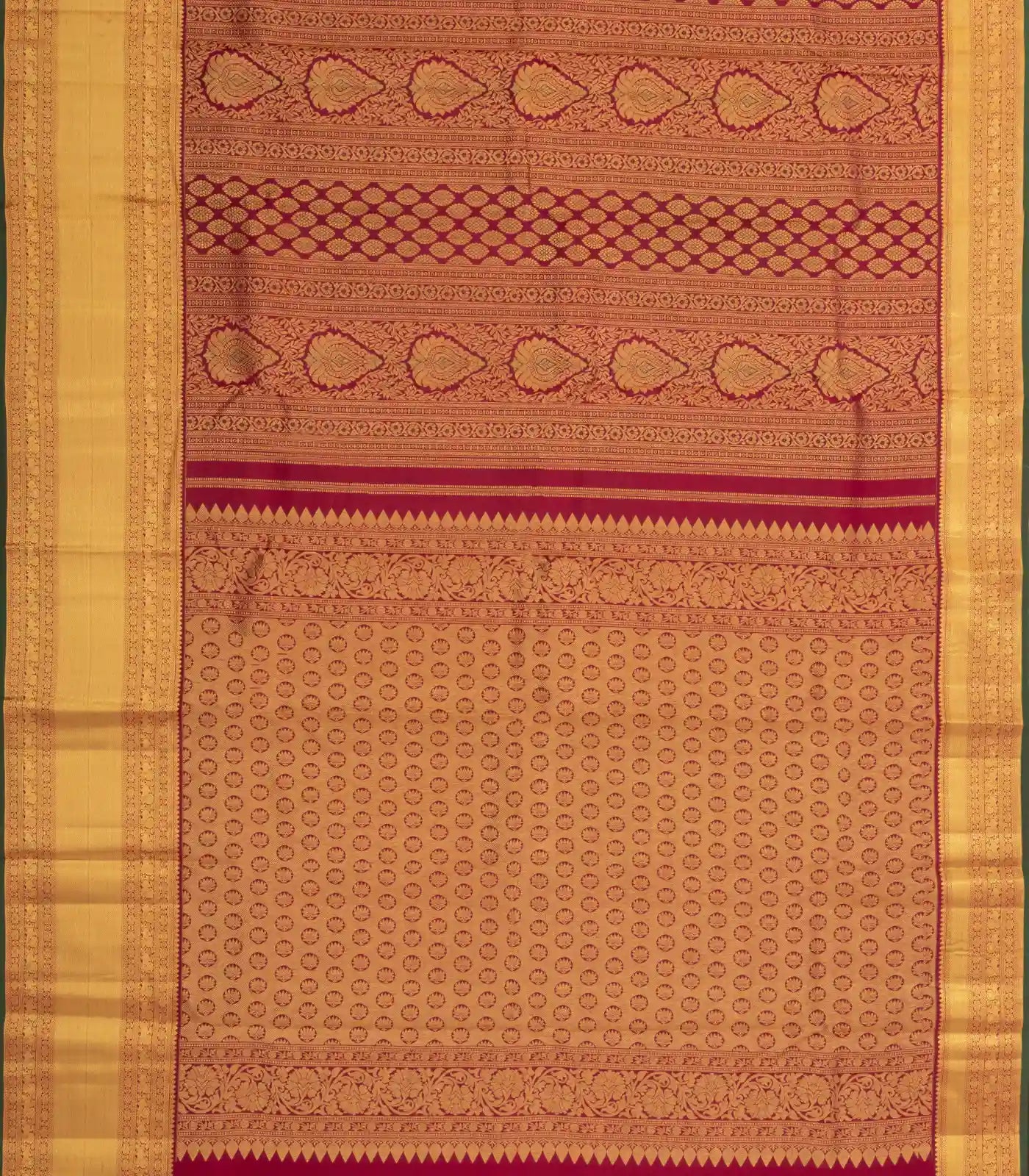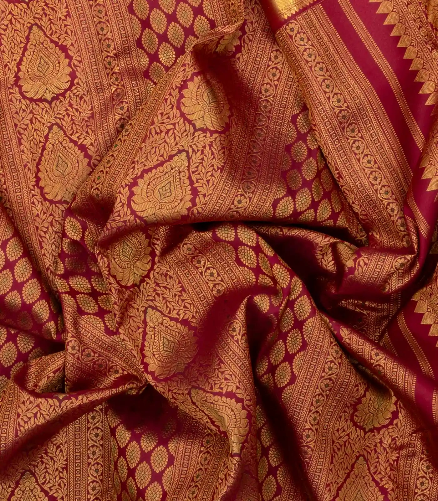 This handwoven kanchipuram silk saree is filled with meena floral motifs in crimson body along with zari border and pallu
