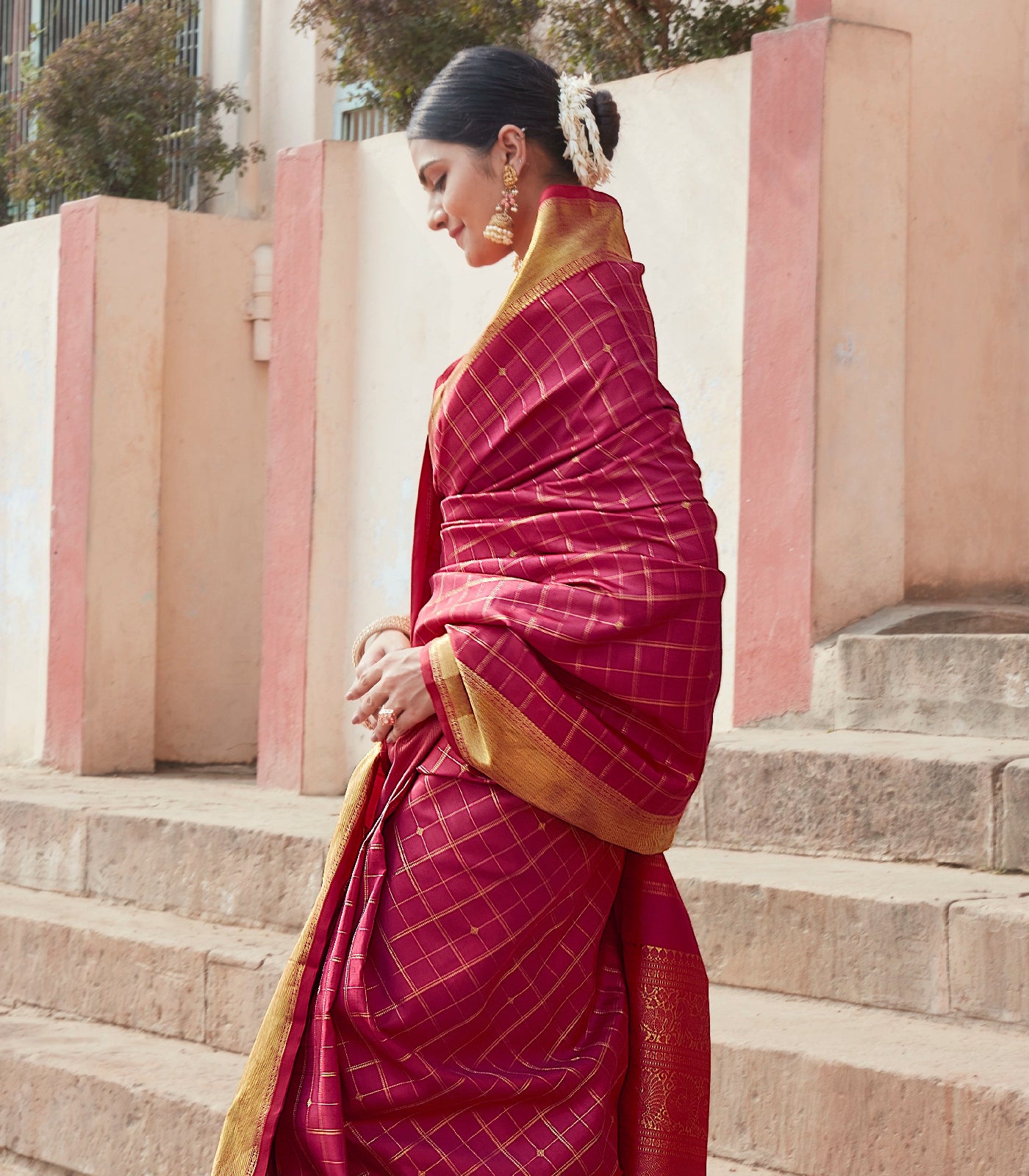 Crimson Handloom Kanchipuram Silk Saree With Zari Checks & Buttas