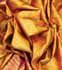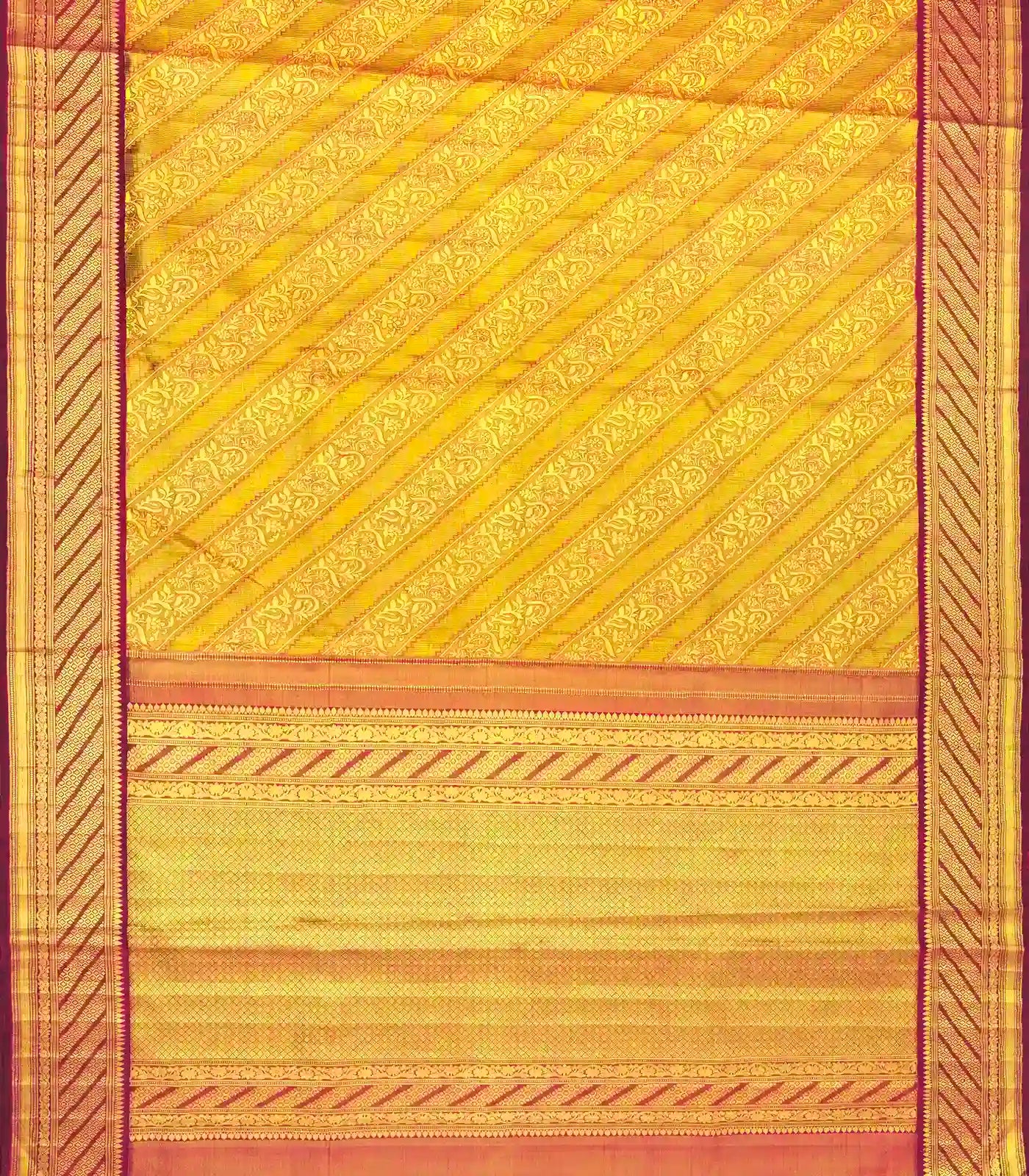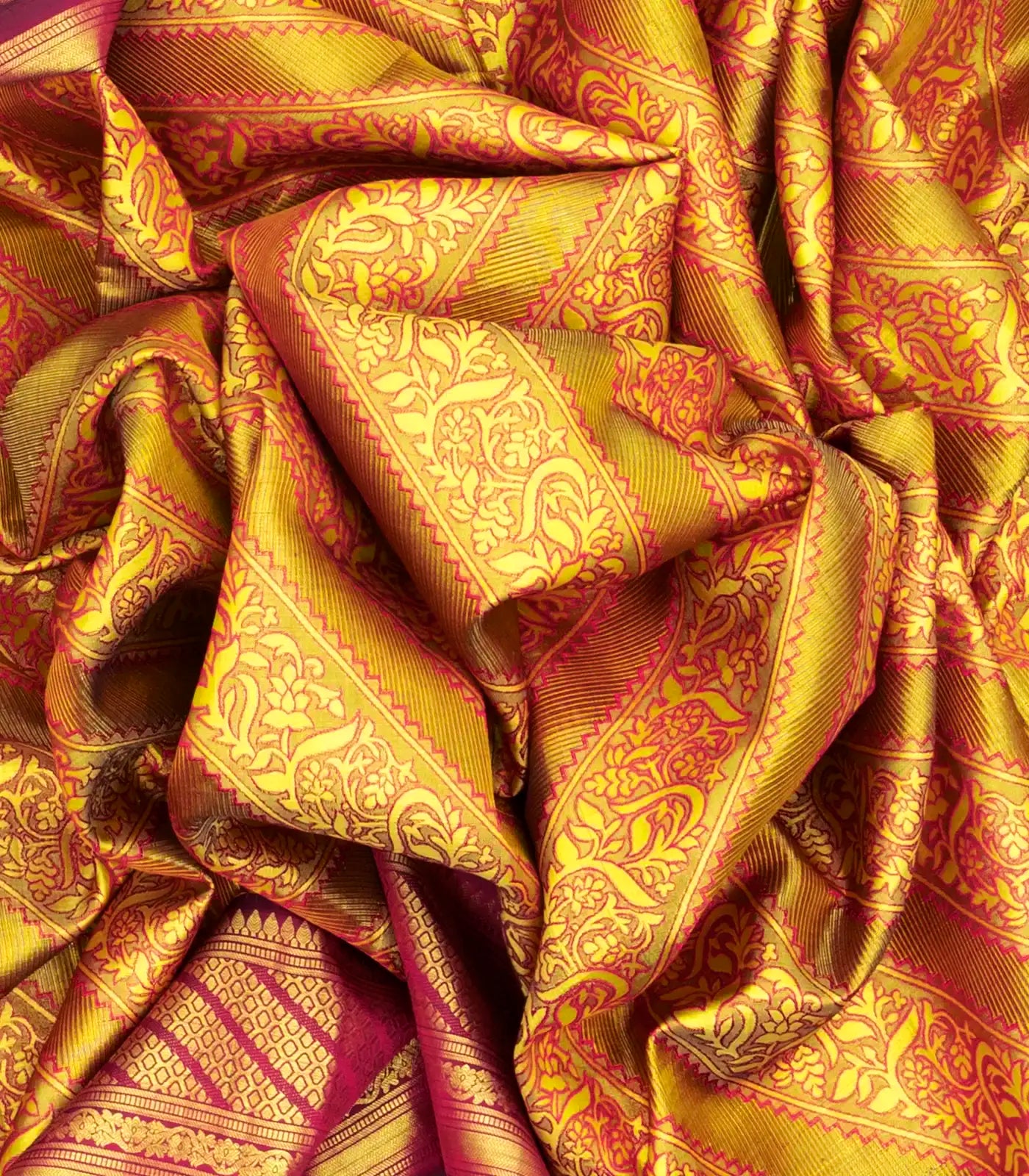 A celebration of heritage and innovation, this exquisite tissue saree is handwoven using RmKV’s patented Lino and Varanjaalam techniques — two exceptional weaving traditions converging in a masterpiece of silk and zari. The body is adorned with diagonal floral motifs, each intricately woven in pure golden zari and soft crimson silk threads, lending a luxurious metallic sheen to the blooms. This shimmering effect gives the motifs a jewel-like presence, as though they are gently glistening with every movement. The motifs are gracefully segmented by the artistry of Lino weaving, creating depth, dimension, and a rhythmic flow across the fabric.