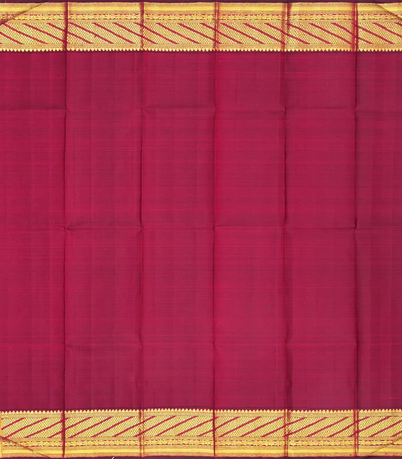 The border and pallu are woven with age-old motifs, each rich in symbolism: Thilagam Mokku (paisley drop), Muthu (pearl), Then Thuli Kan (dew drop), Kodi Visiri (creeper with fan-like elegance), Vanki (ornate armlet), and Diamond (radiance and brilliance). Pastel highlights and intricate craftsmanship bring these motifs to life, completing a composition that speaks of both tradition and grandeur.