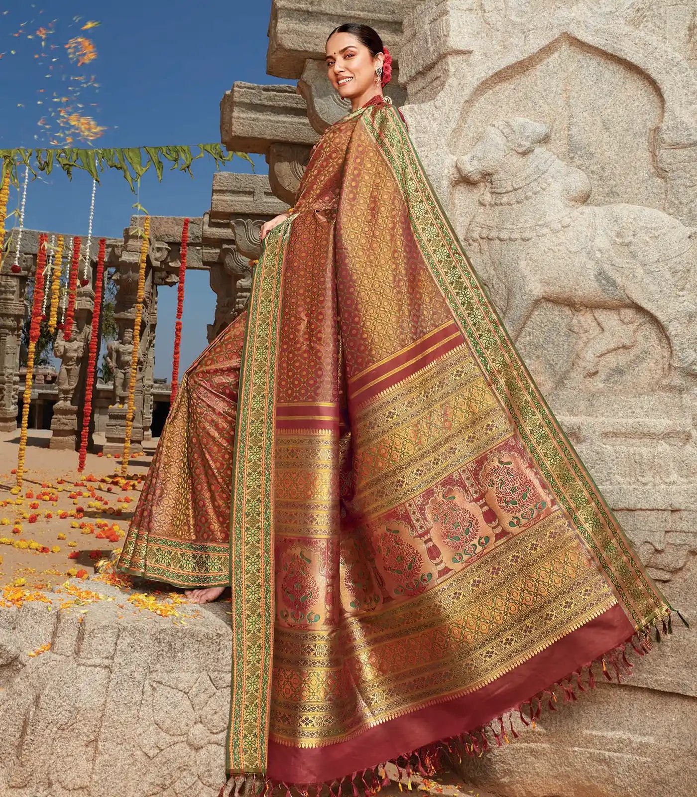 This Kanchipuram weaves inspired by the Paithani weave is made with the utmost attention. This saree is brocaded using pure golden zari on a crimson body. The beauty of Paithani Pallu lies in the rudraksham motif enclosed by a honeycomb pattern. The crimson shade which is the defining feature of this saree is derived from the natural ingredient - Lac. The alluring Meenakari effect used in the rustic orange pallu is an inspiration from the Paithani weave used in our Kancheepuram weave. In the pallu the luscious mango motifs, with regal peacocks nestled within the fruit’s embrace. The designs on the pallu and border motifs take inspiration from Mughal designs. The contrasting naturally dyed green border looks attractive with indigo naturally dyed with mulberry leaves. This saree is inspired by the wardrobe of Martha King Sivaji and his wife Saitamba Bai, who ruled the Tanjore region during the 18th century. Embrace the silk heritage of India in your wedding with RmKV revival silk sarees - inspired by the royals and crafted by RmKV Masterweavers.
