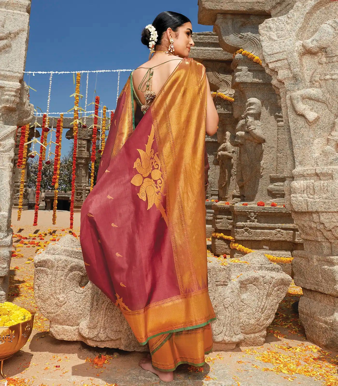 This stunning Uppada Parrot is a traditional Kanchipuram saree from the RmKV Revival silk saree Collection. The alluring saree is inspired from an old Uppada saree in which the double parrot motif has been originally woven using the Jamdani technique. This has been expertly recreated in the Kanchipuram weave by RmKV masterweavers. The body with the rich crimson sheen is naturally dyed using Lac and is intricately adorned with delicate miniature parrots. Embrace the silk heritage of India in your wedding with RmKV revival silk sarees - inspired by the royals and handcrafted by RmKV.