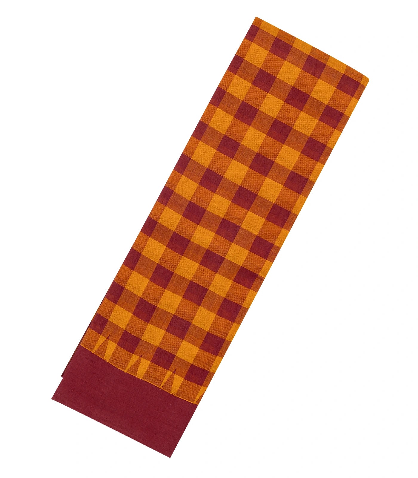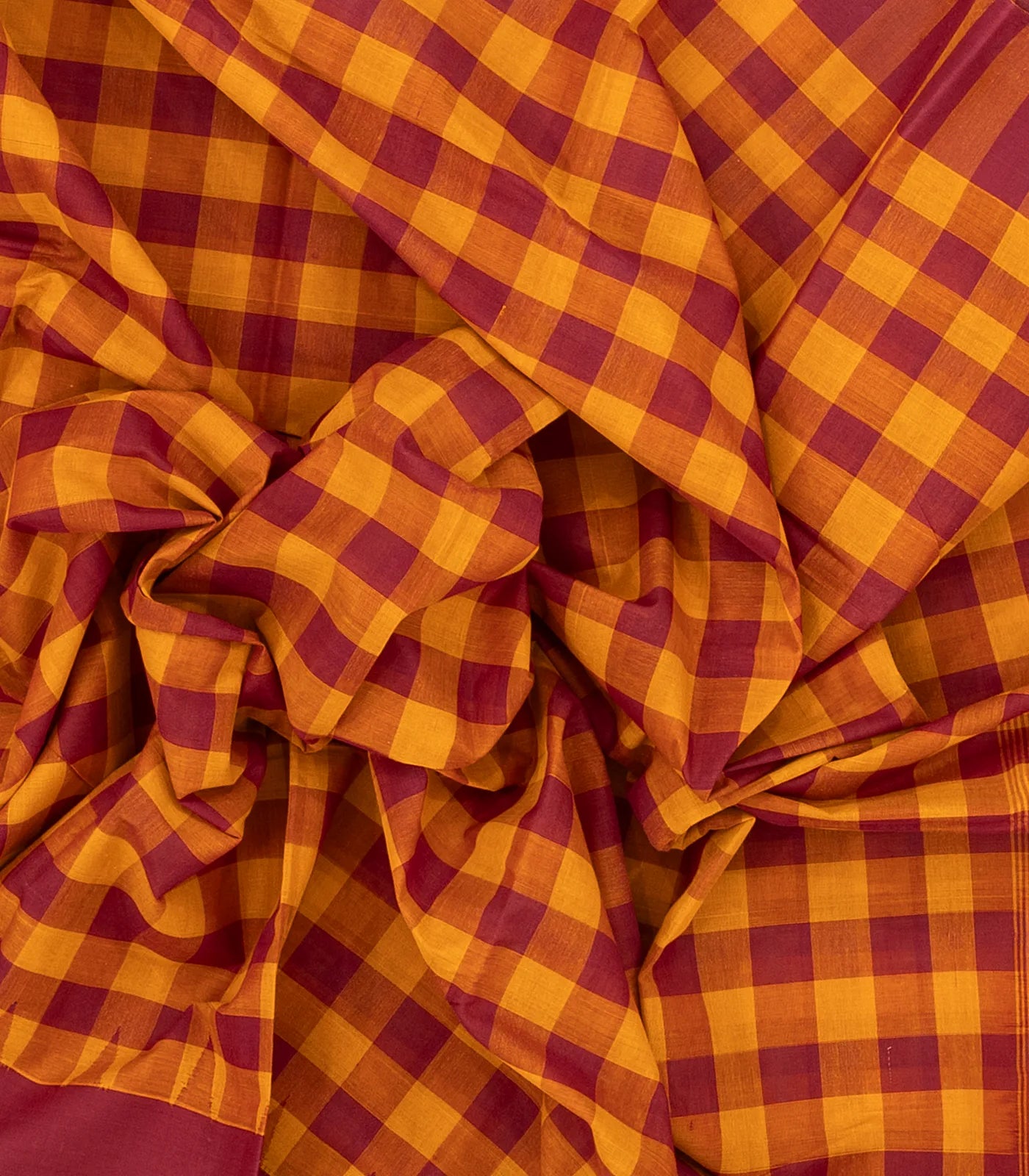 This handwoven rasipuram cotton saree is filled with checks in crimson body along with contrast border and pallu