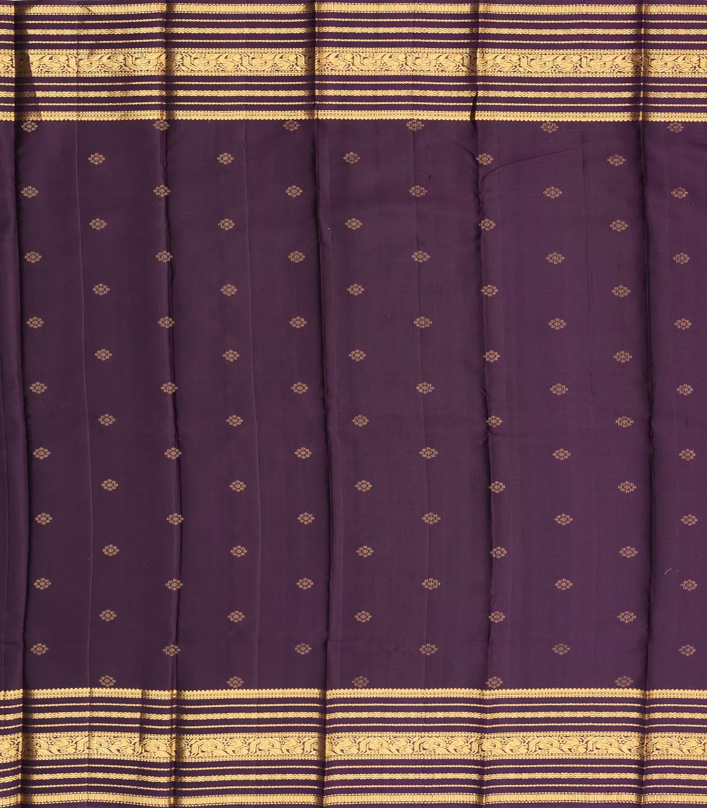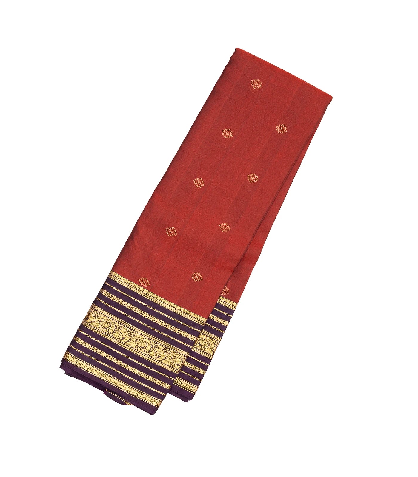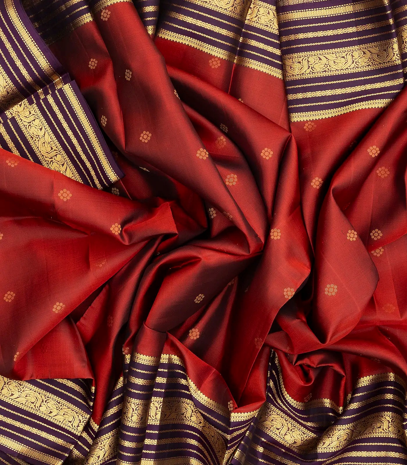 This handwoven soft silk saree is filled with zari buttas in crimson body along with contrast border and pallu
