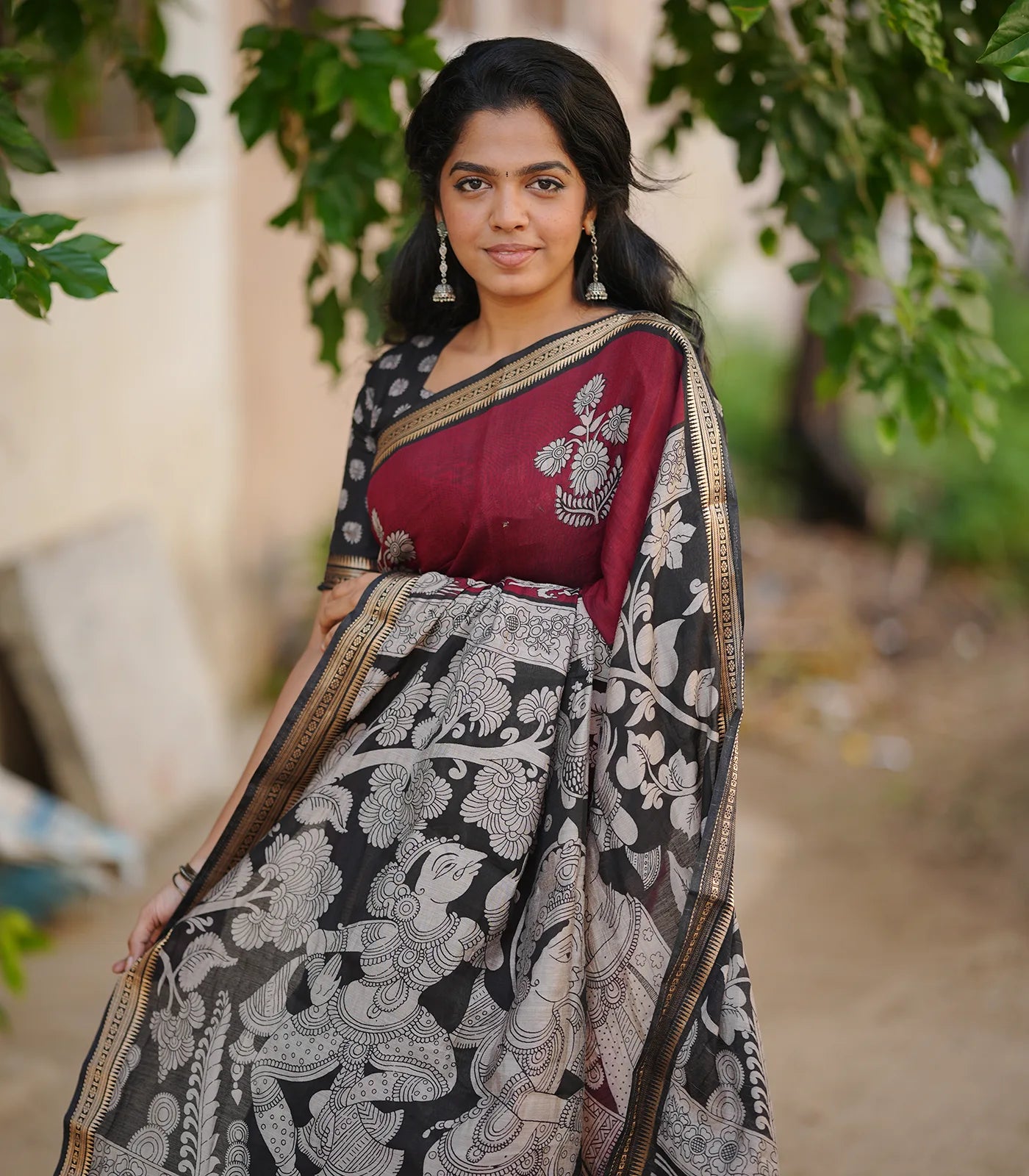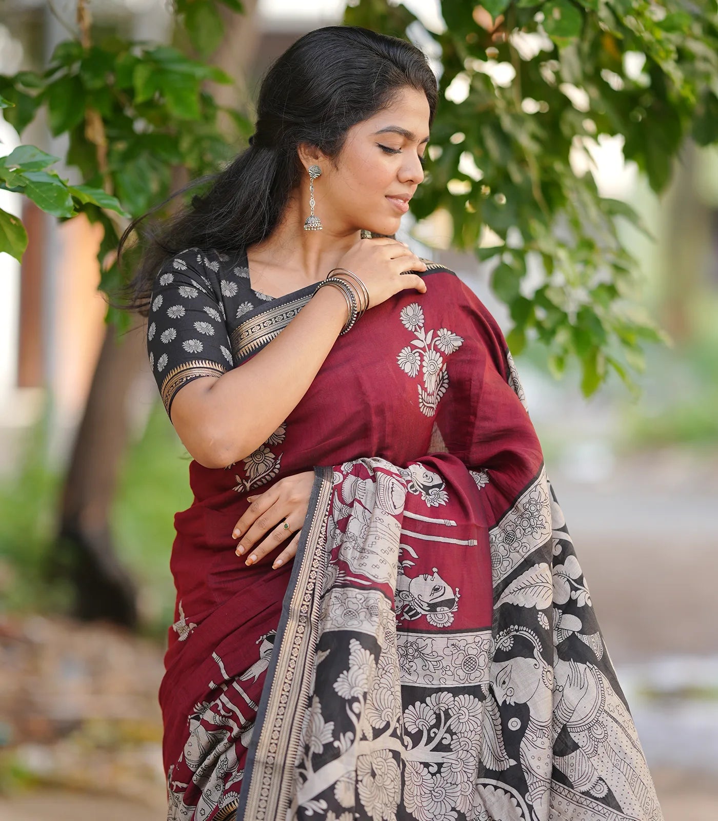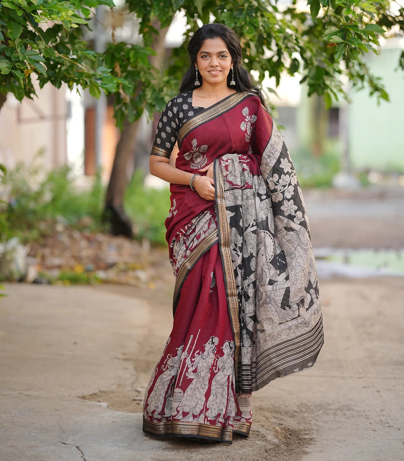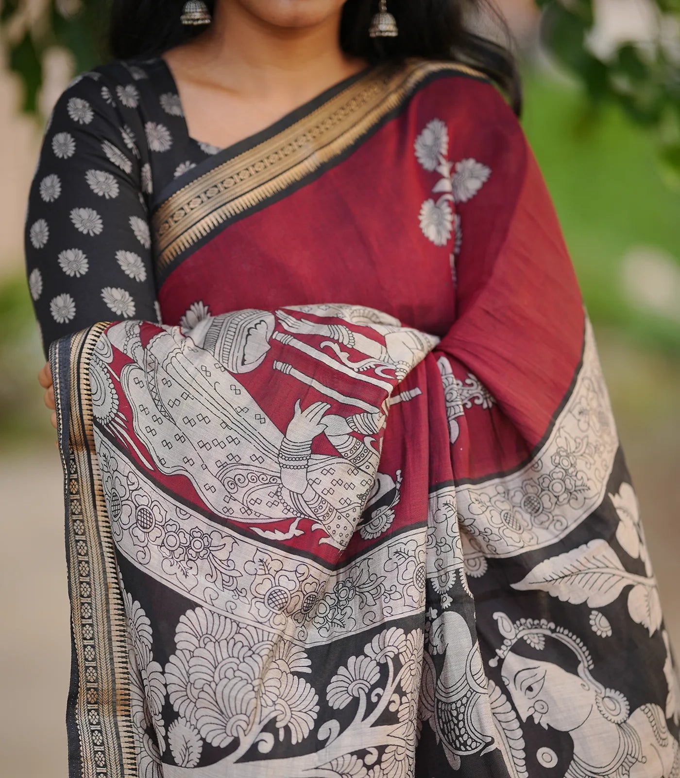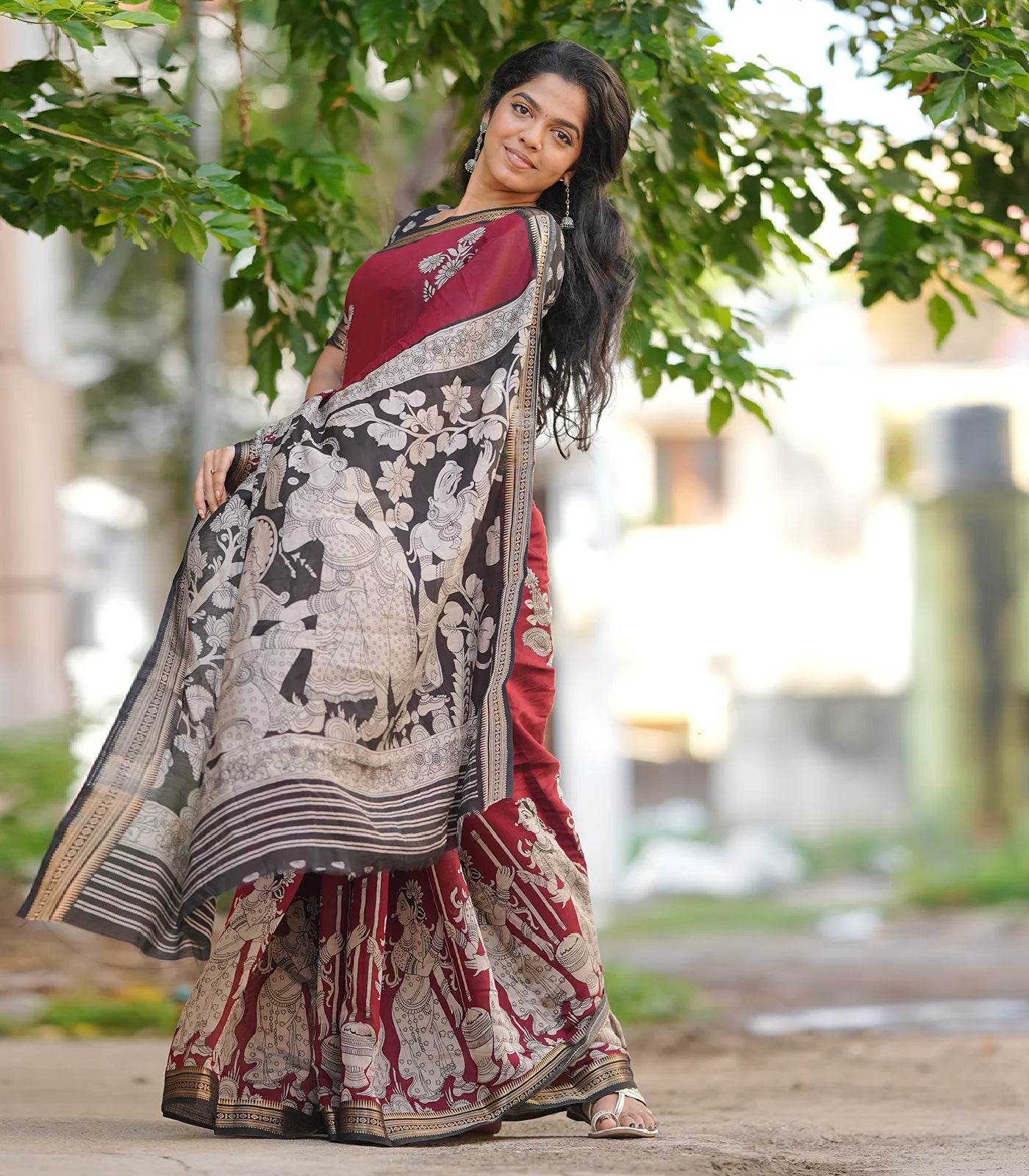 This woven art chanderi saree is printed with floral motifs in crimson body along with contrast black border and pallu