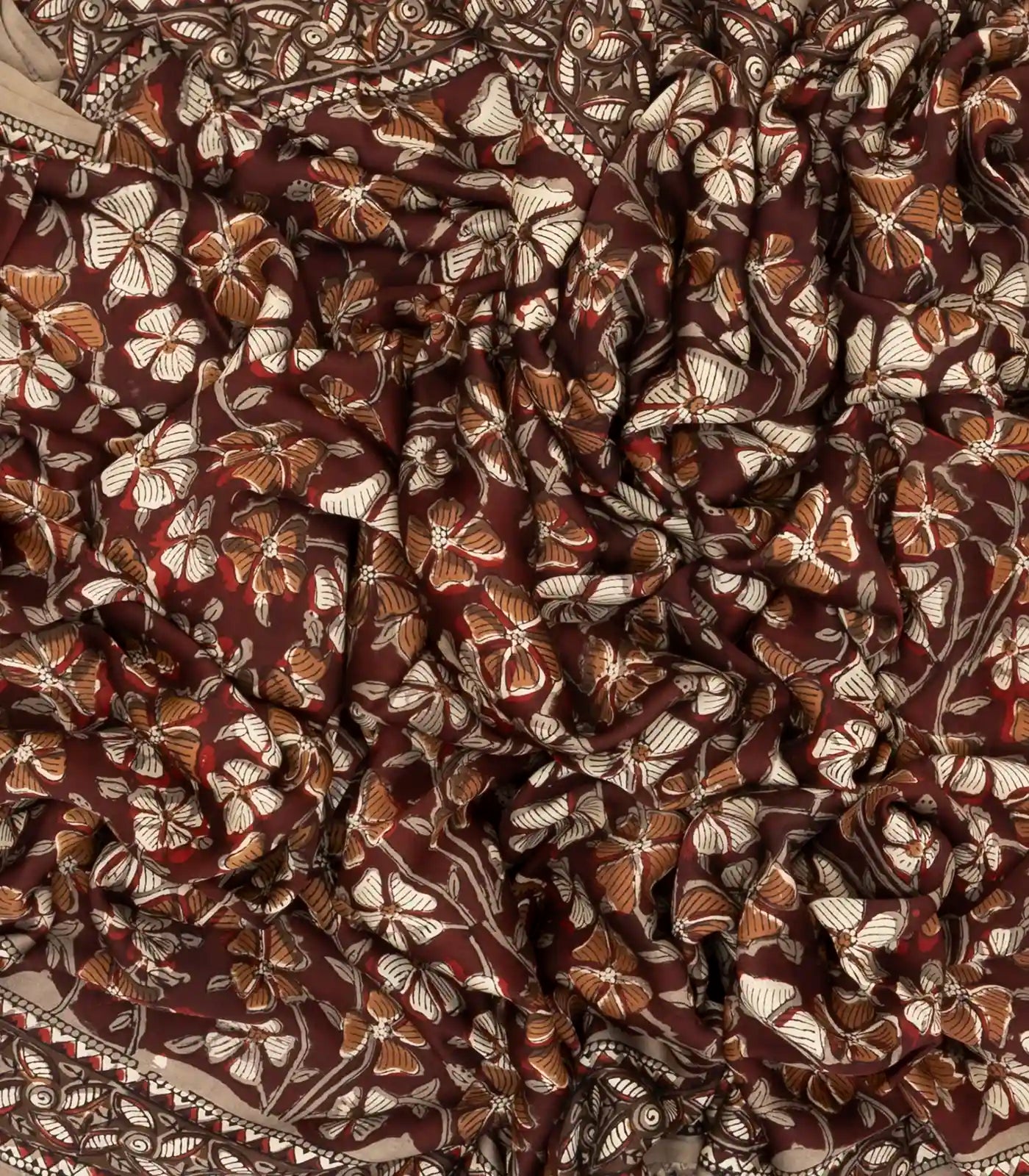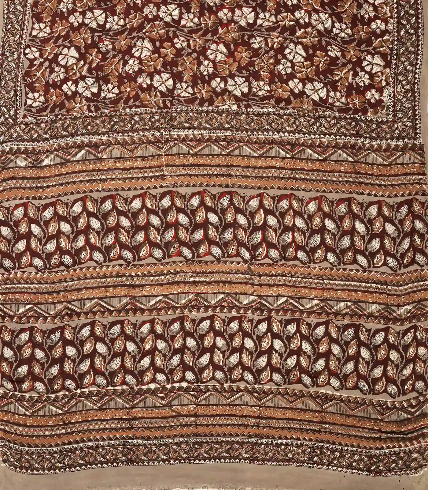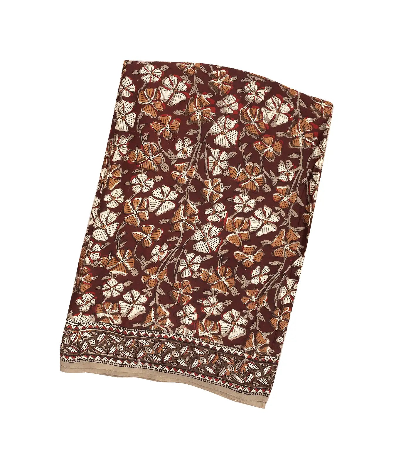 This woven modal silk saree is filled with ajrakh printed floral motifs in brown body along with border and pallu