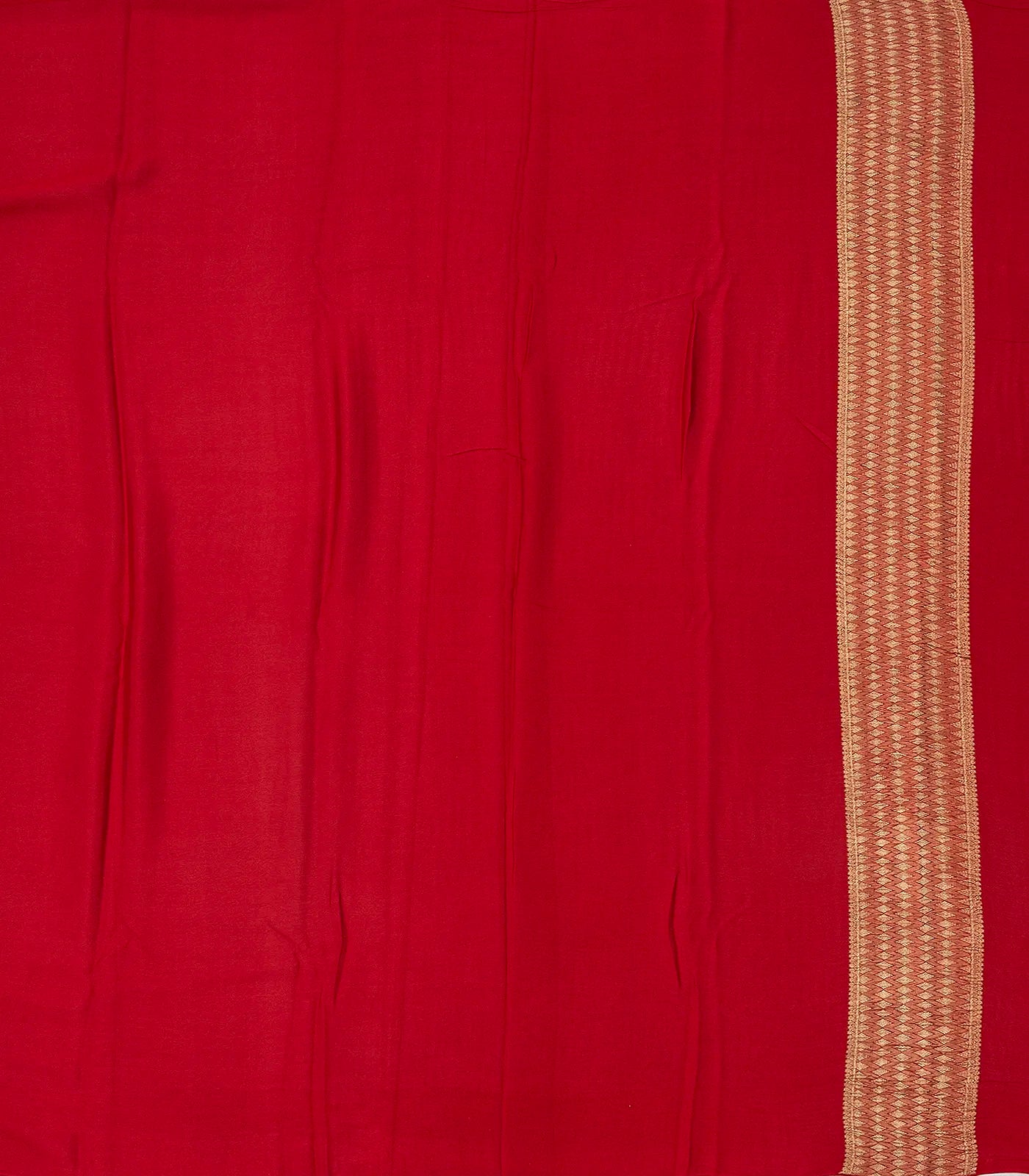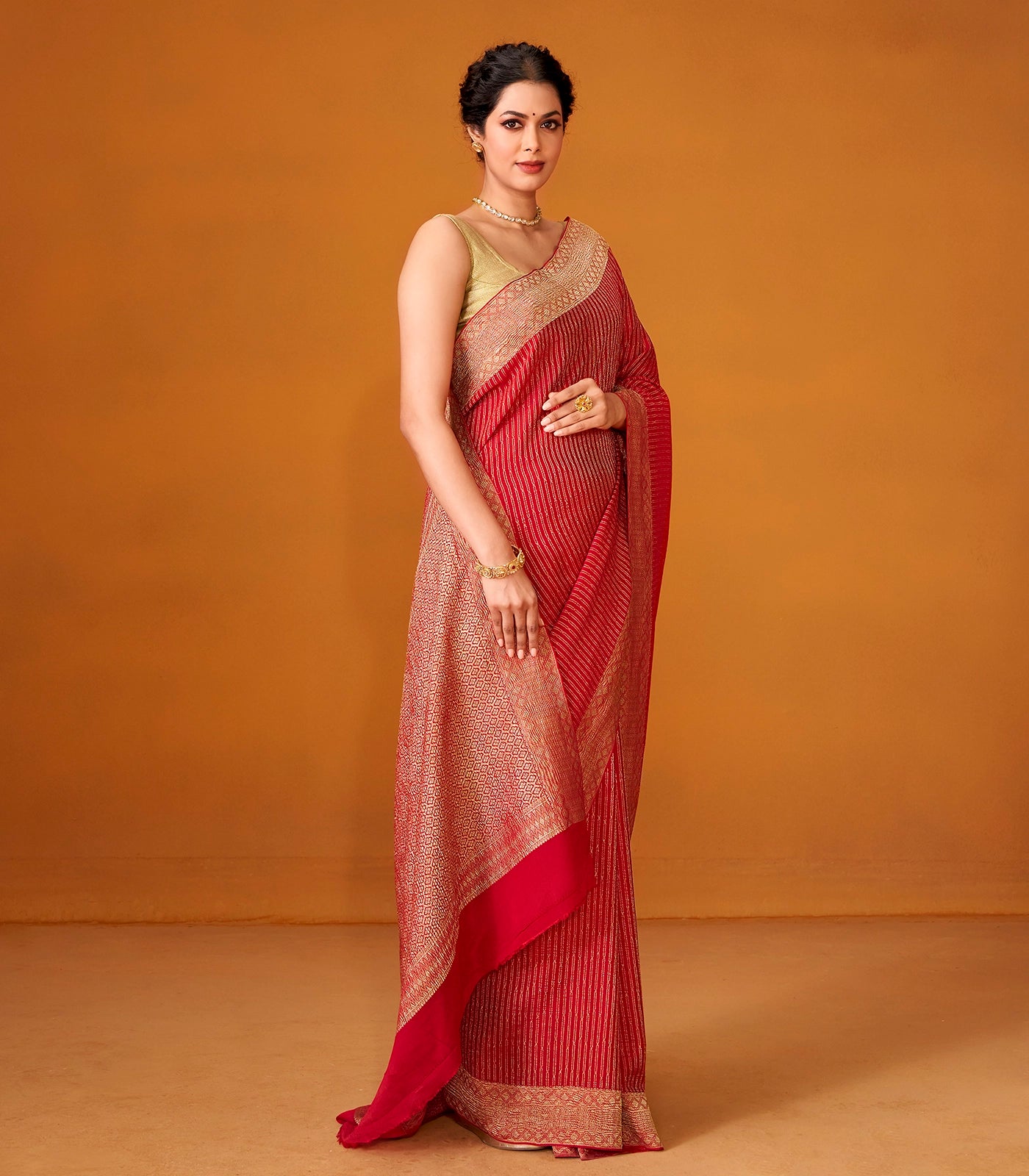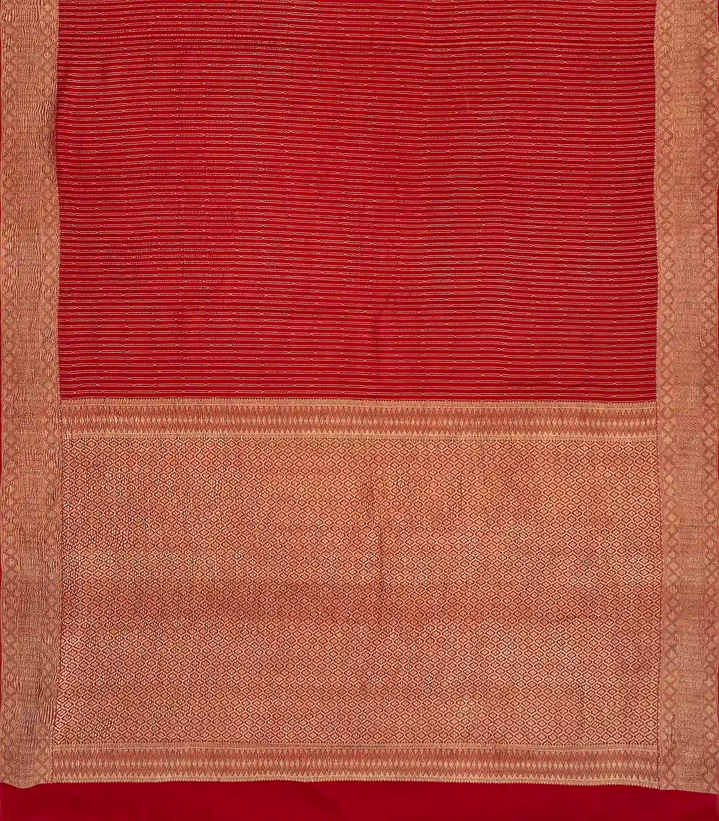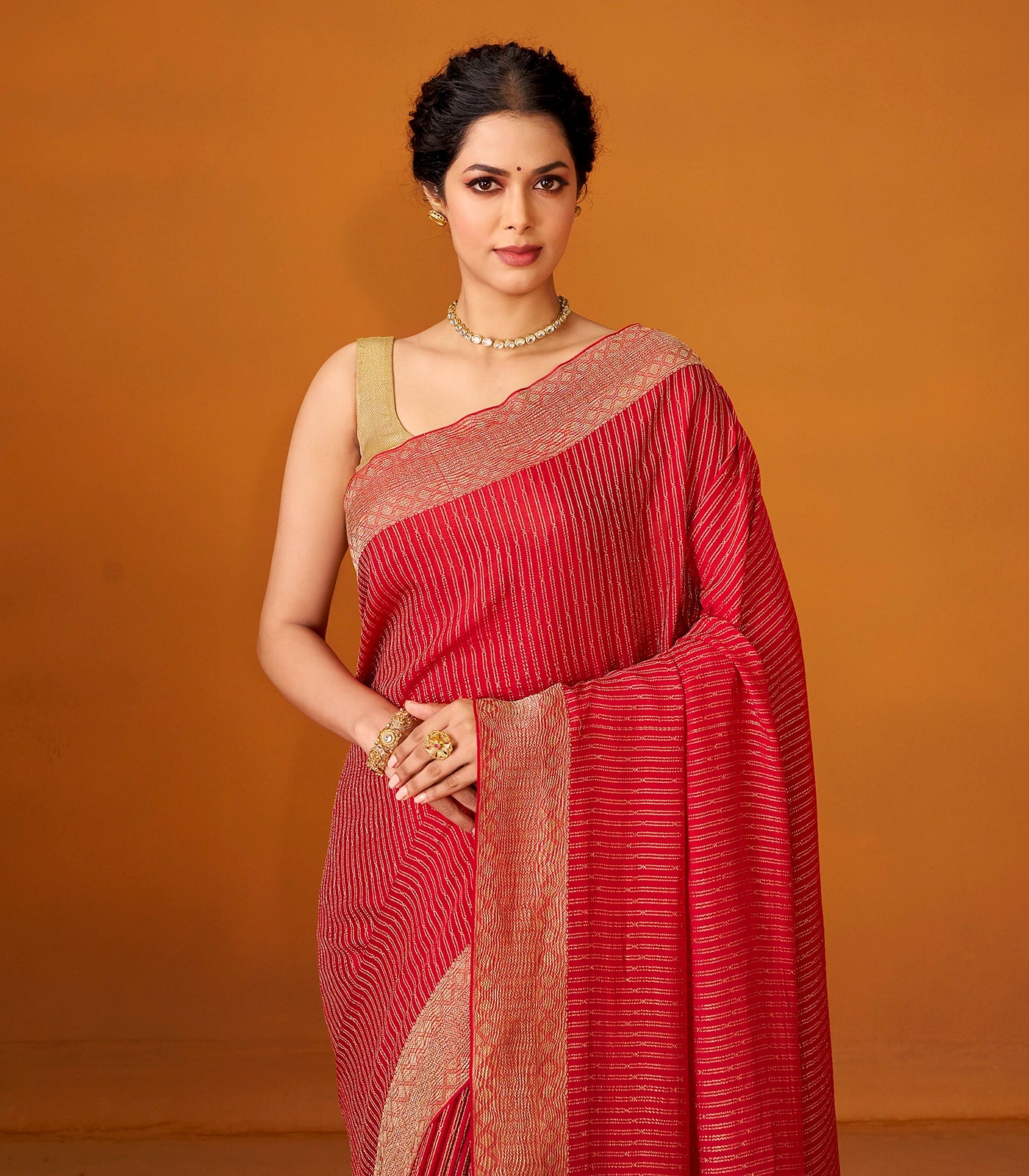 This woven mysore crepe silk saree is filled with zari stripes in crimson body along with border and pallu