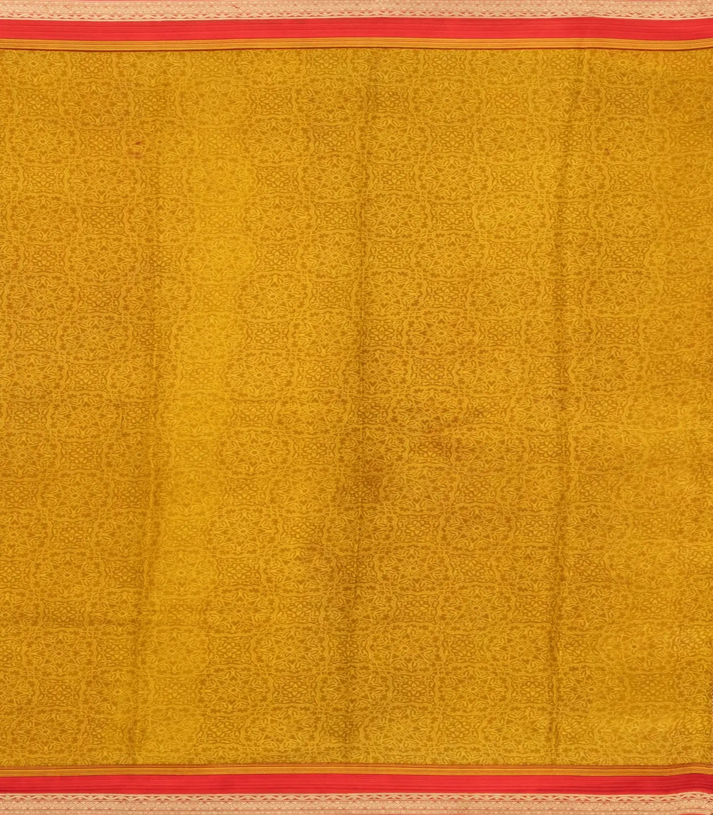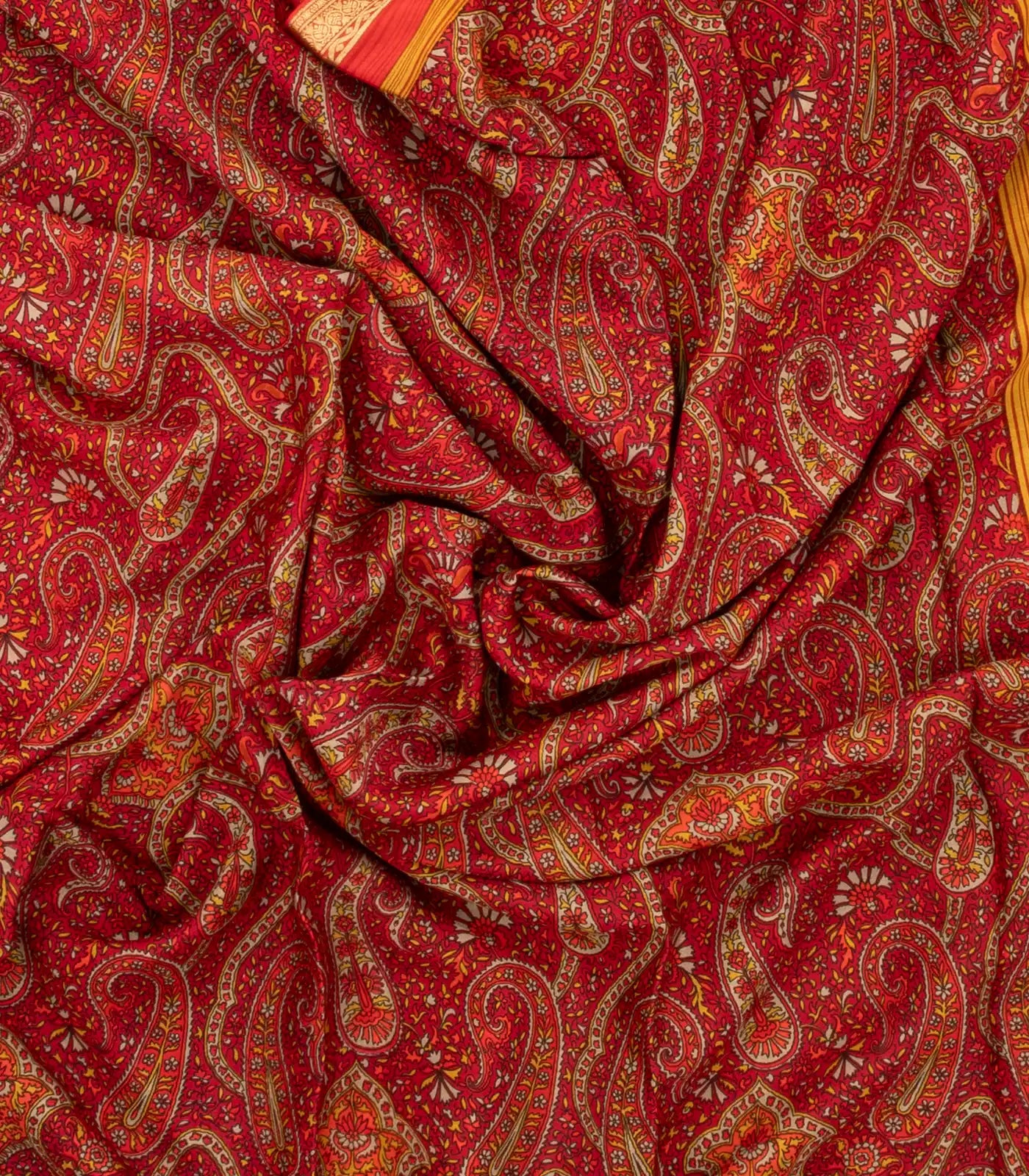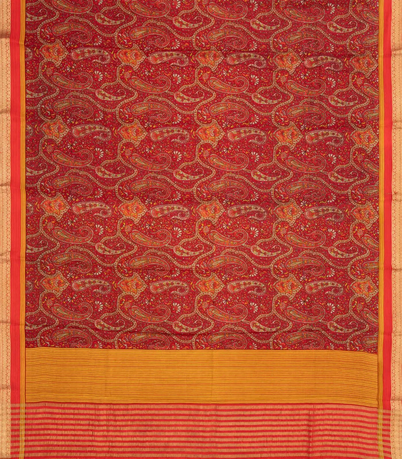 This woven pure silk saree is filled with printed floral motifs in crimson body along with border and pallu