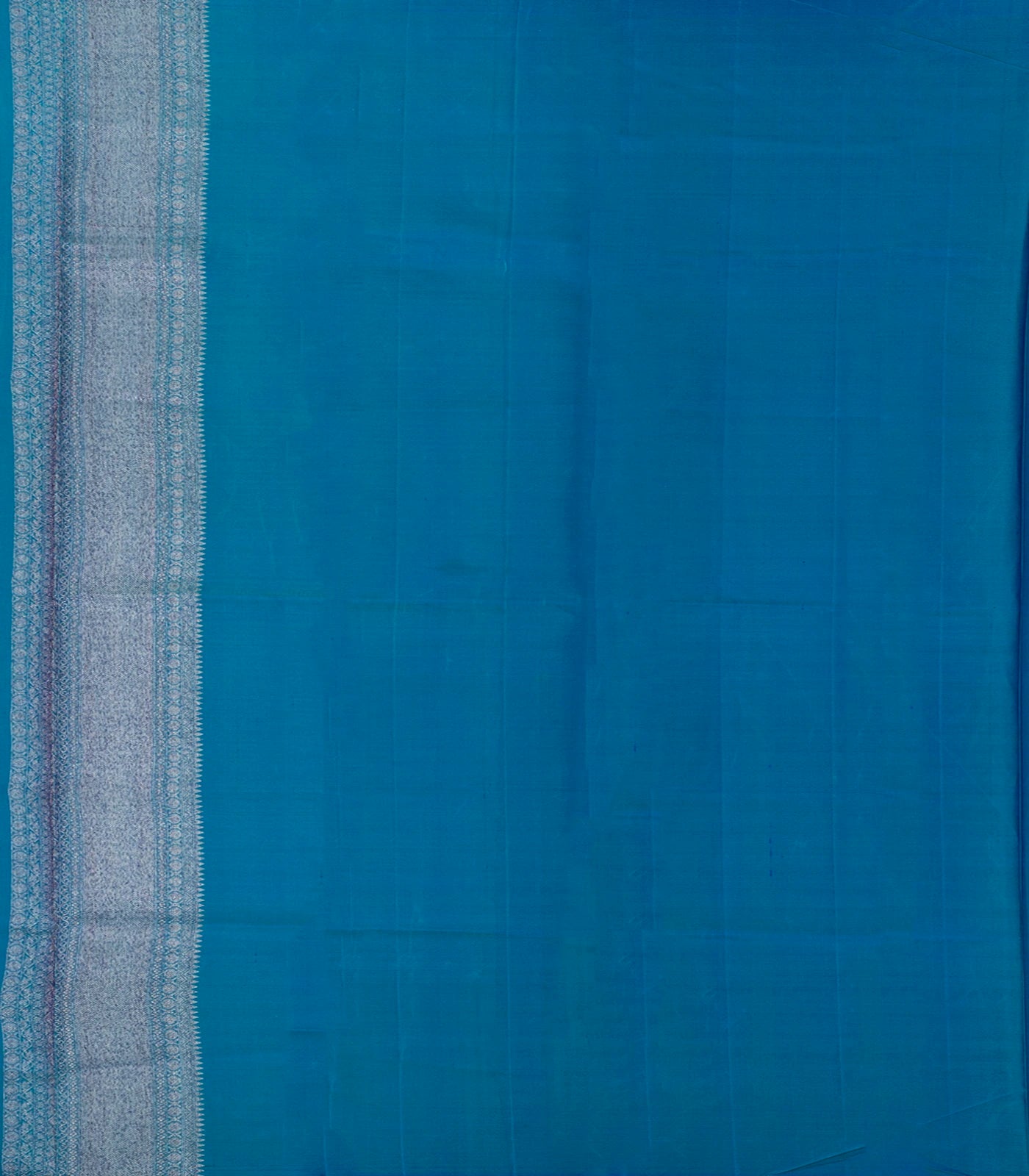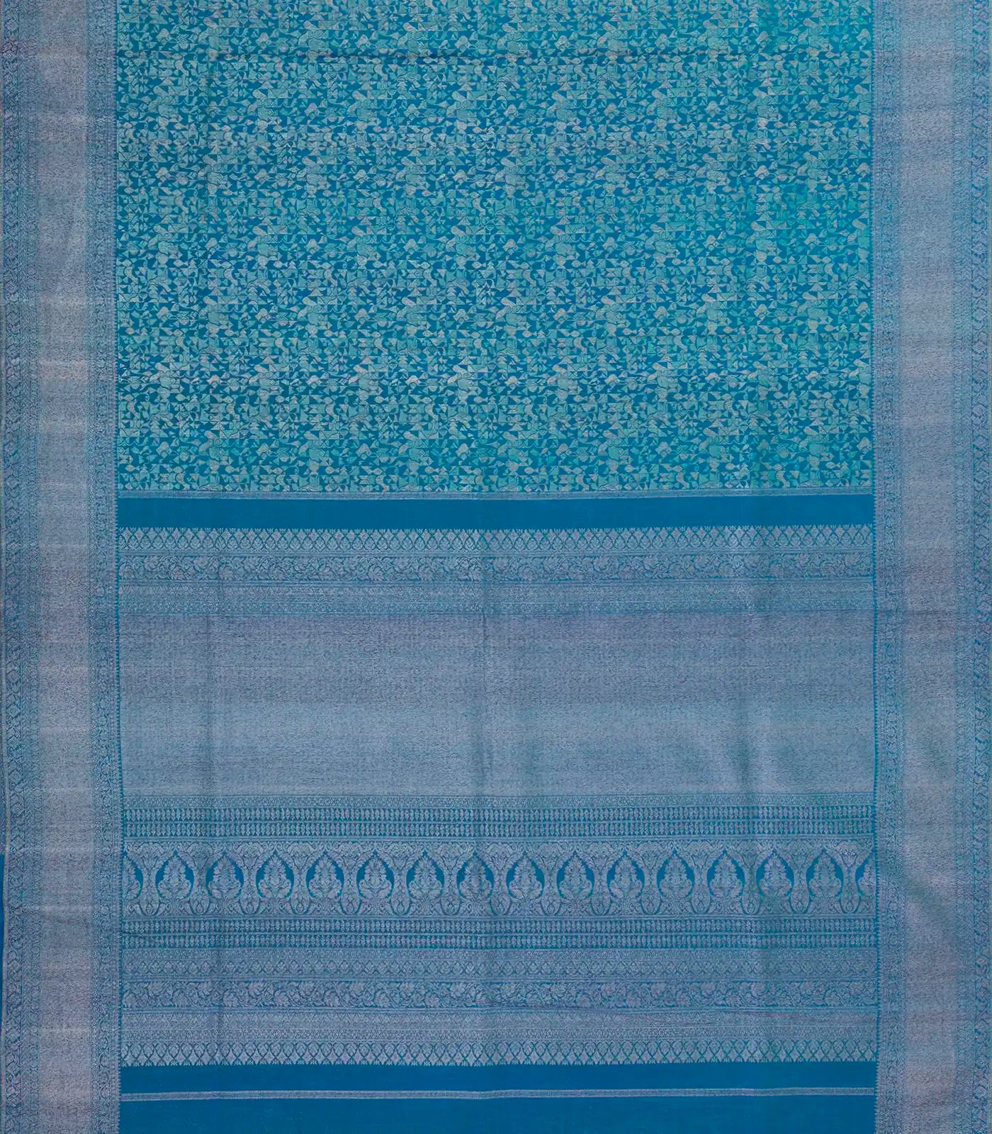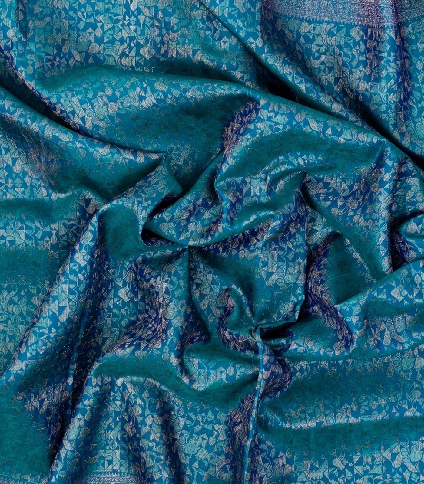 This handwoven kanchipuram silk saree is filled with abstract motifs in cyan body along with zari border and pallu