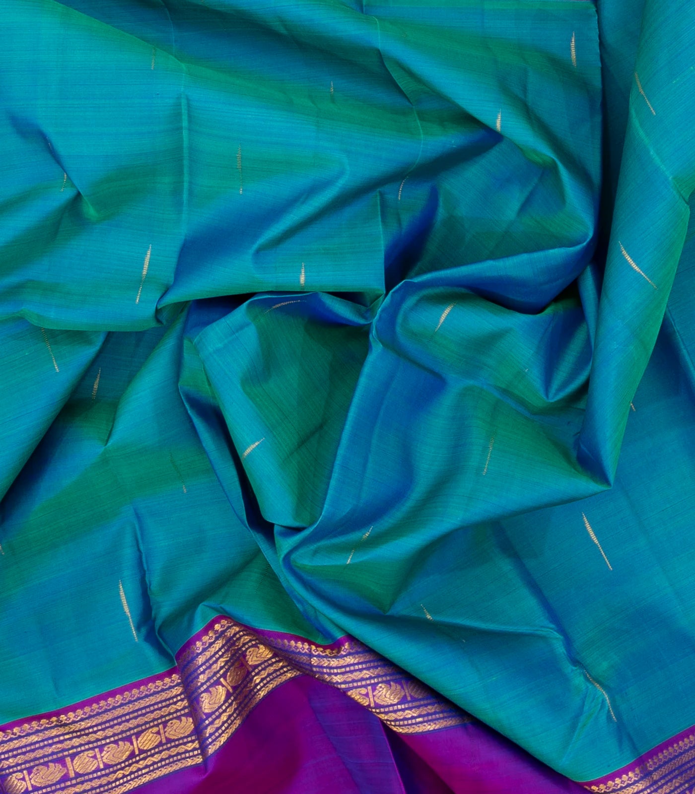 This handwoven kanchipuram silk saree is filled with jasmine bud buttas in cyan body along with contrast border and pallu