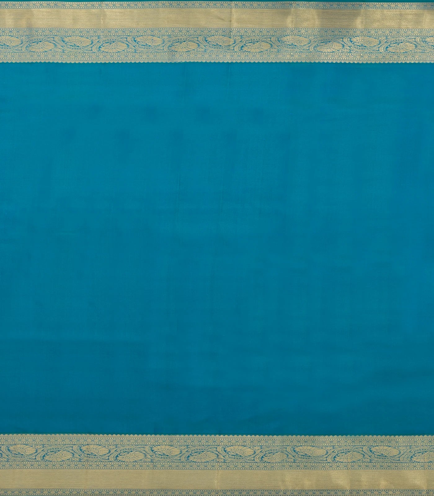 This handwoven kanchipuram silk saree is filled with meena floral motifs in cyan body along with zari border and pallu
