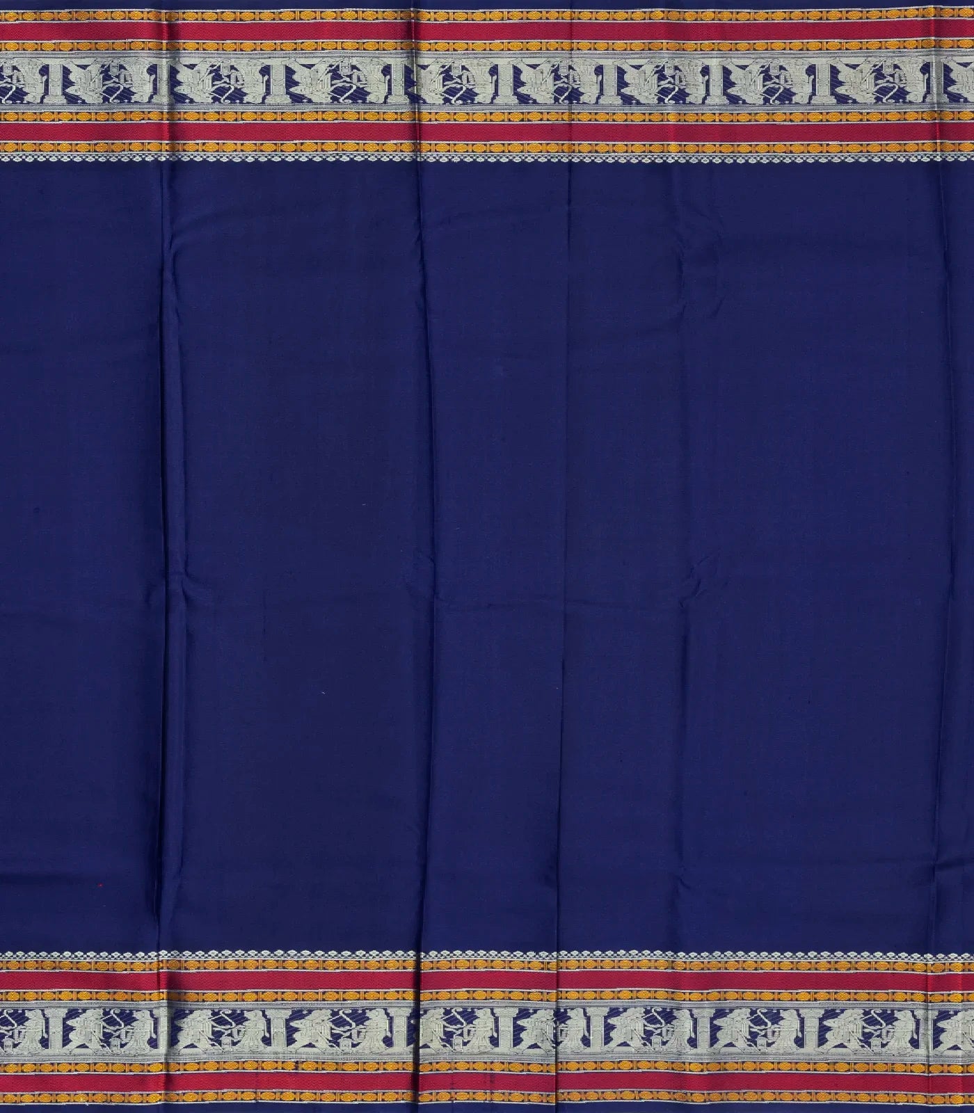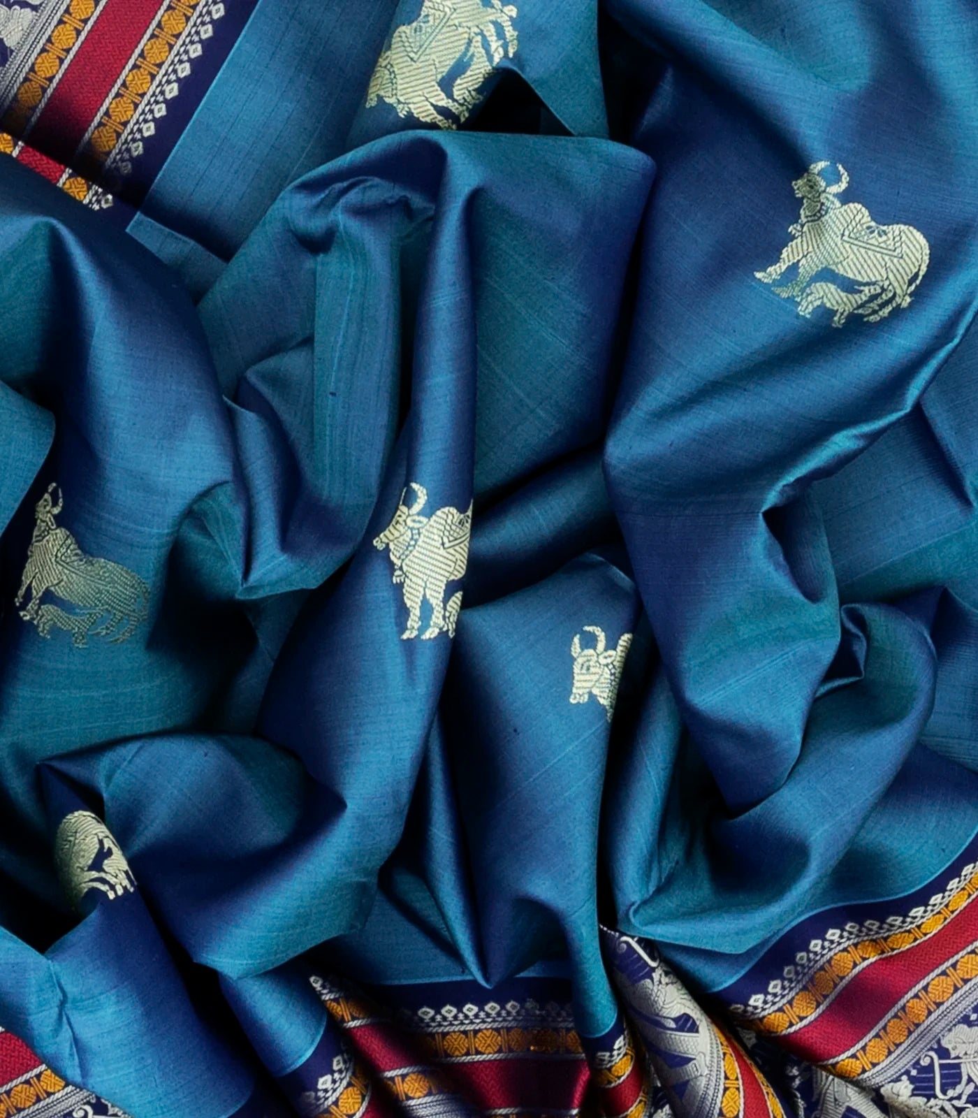 This handwoven kanchipuram silk saree is filled with ox buttas in cyan body along with lord ram motifs in contrast border and pallu